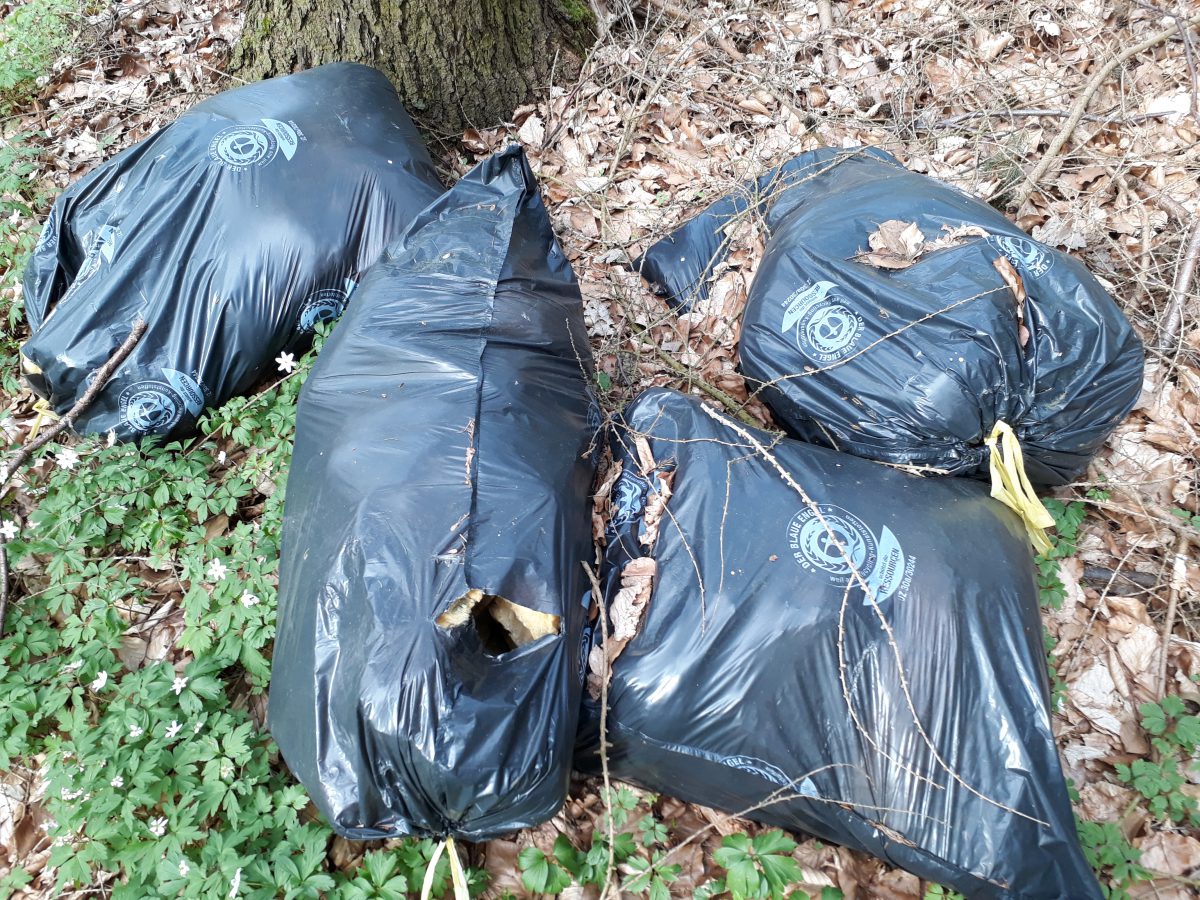 Makaberer geht’s nicht: In vier Säcken, die ein Umweltzeichen tragen, ist im Wald bei Rügeband Dämmwolle entsorgt worden.