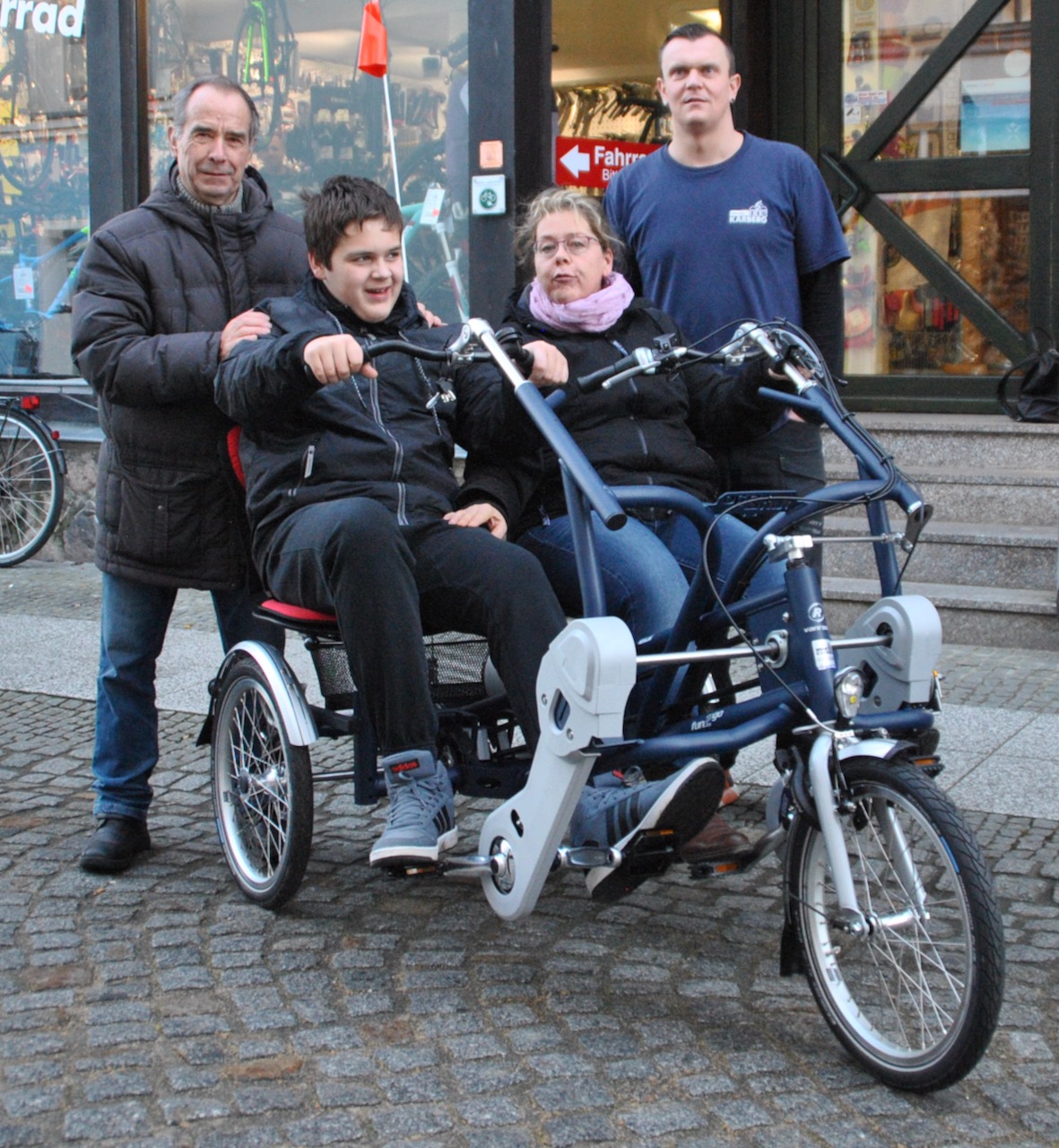 Schön während der Spendenaktion hat Peter Hoffmann Kontakt zur Warener Zweiradfirma Firma Karberg aufgenommen. So wurde dann auch ein Modell, das für die Familie in Frage kommt, gefunden. Bei der Bestellung ging es nun darum, die genauen Details abzustimmen, die wichtig für die Sicherheit beim Fahren waren. „Hier möchte ich Herrn Tretow besonders erwähnen. Er hat sich um alle Fragen rund ums Rad gekümmert.“