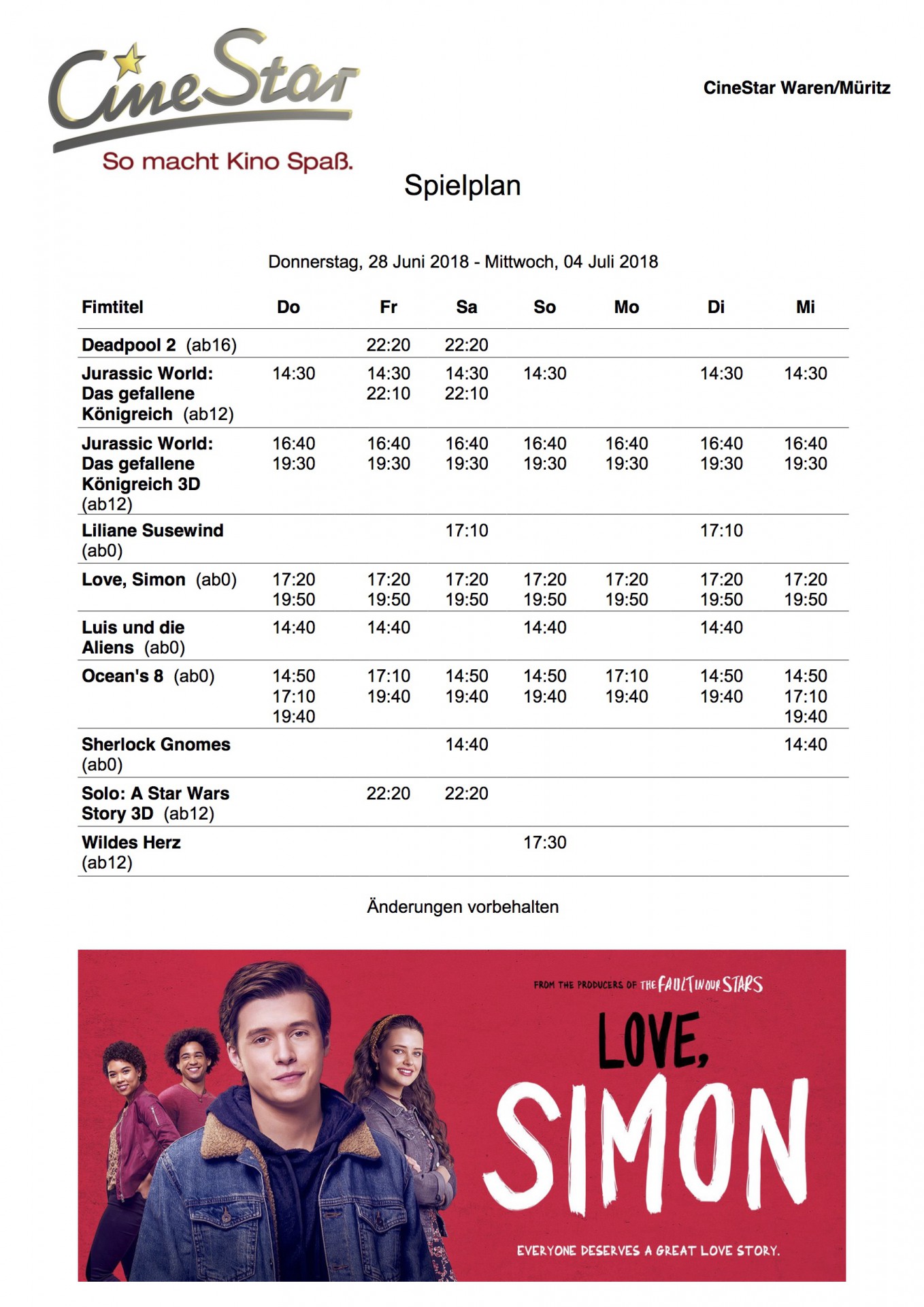 Vielleicht hilft Kino ja gegen den Frust… Hier das aktuelle Kinoprogramm für das CineStar Waren ab morgen mit dem Neustart „Love, Simon“.