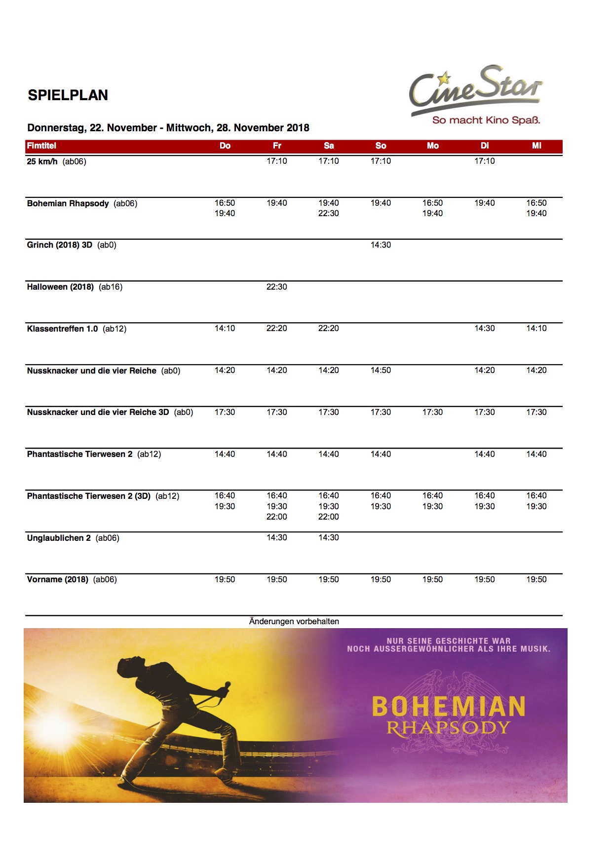 Hier das aktuelle, ab morgen gültige Kinoprogramm für das CineStar in Waren mir der Sondervorstellung So. 25.11. HappyFamily-Vorpremiere „Der Grinch“ 3D 14.30 Uhr und dem Neustart „Bohemian Rhapsody“.