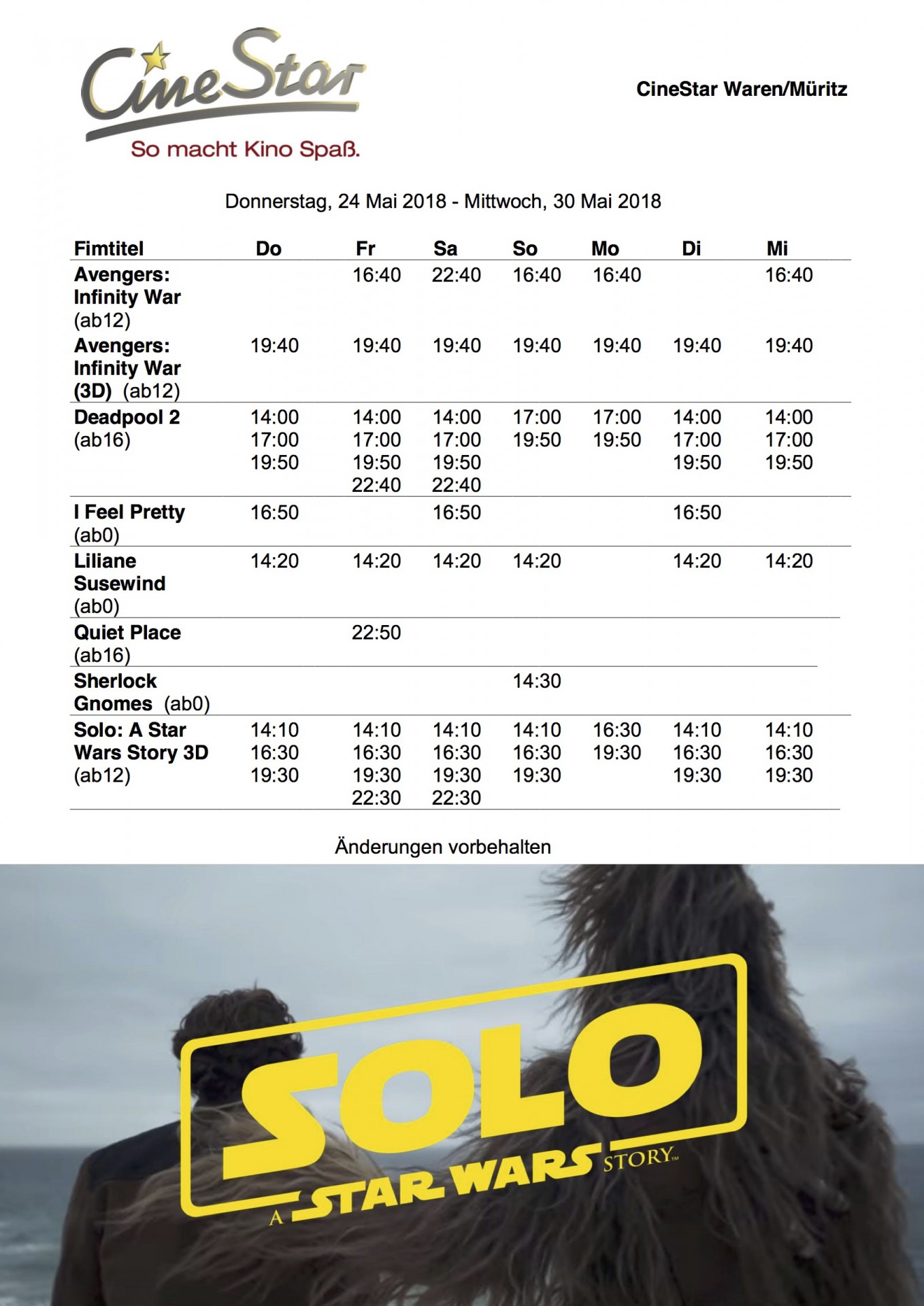 Viel interessanter als irgendwelche Datenschutzerklärungen: Das neue Kinoprogramm für das CineStar Waren mit dem Neustart „Solo: A Star Wars Story“: