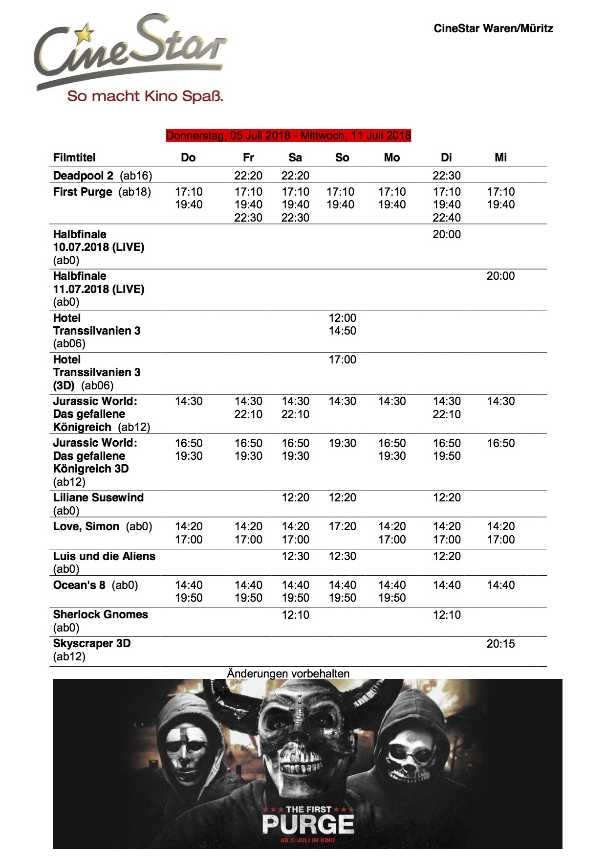 Hier das aktuelle Kinoprogramm ab Donnerstag mit dem Neustart: „First Purge“: