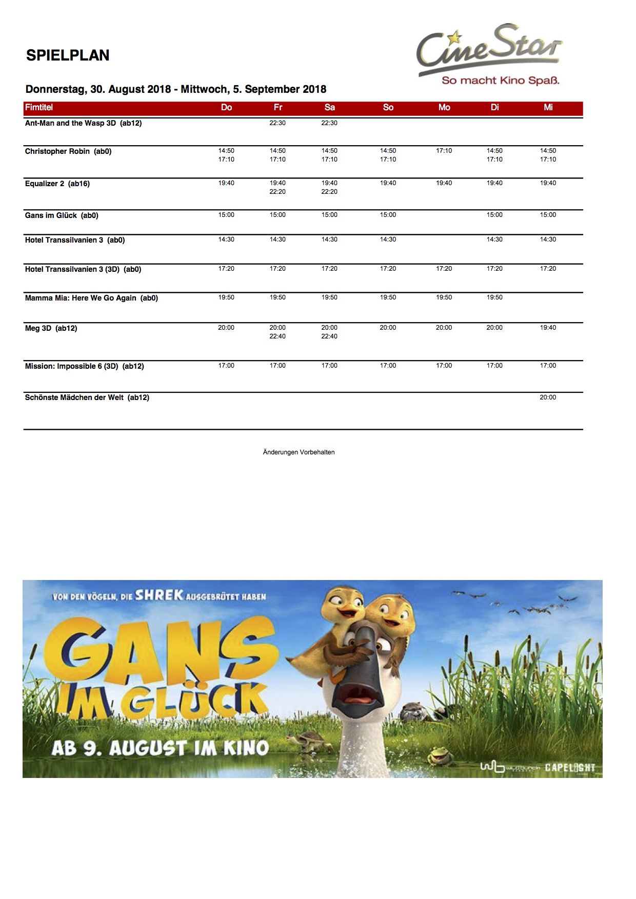 Das ab heute gültige Kinoprogramm für das CineStar in Waren: