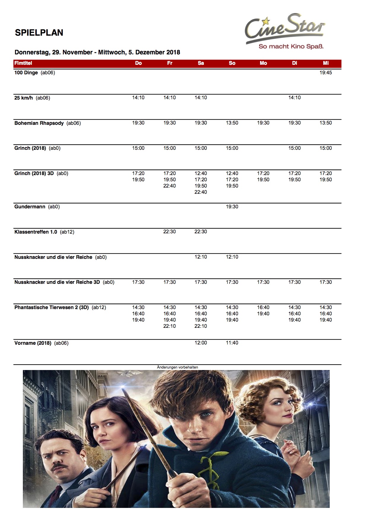 Das ab heute gültige Kinoprogramm des CineStar Waren mit dem