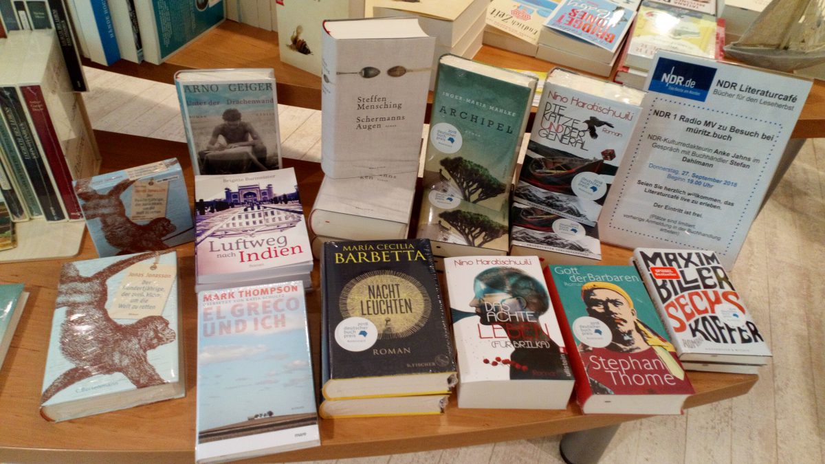 m morgigen Donnerstag, 27. September, gastiert das Literaturcafé des NDR 1 Radio MV in der Warener Buchhandlung müritz.buch in der Langen Straße 13. Kulturredakteurin Anke Jahns wird ab 19 Uhr mit dem Buchhändler Stefan Dahlmann ins Gespräch kommen über lesenswerte Neuerscheinungen, darunter auch die Titel der Shortlist für den Deutschen Buchpreis 2018. Zudem wird die Autorin Brigitte Burmeister aus Ihrem Roman „Luftweg nach Indien“ lesen.