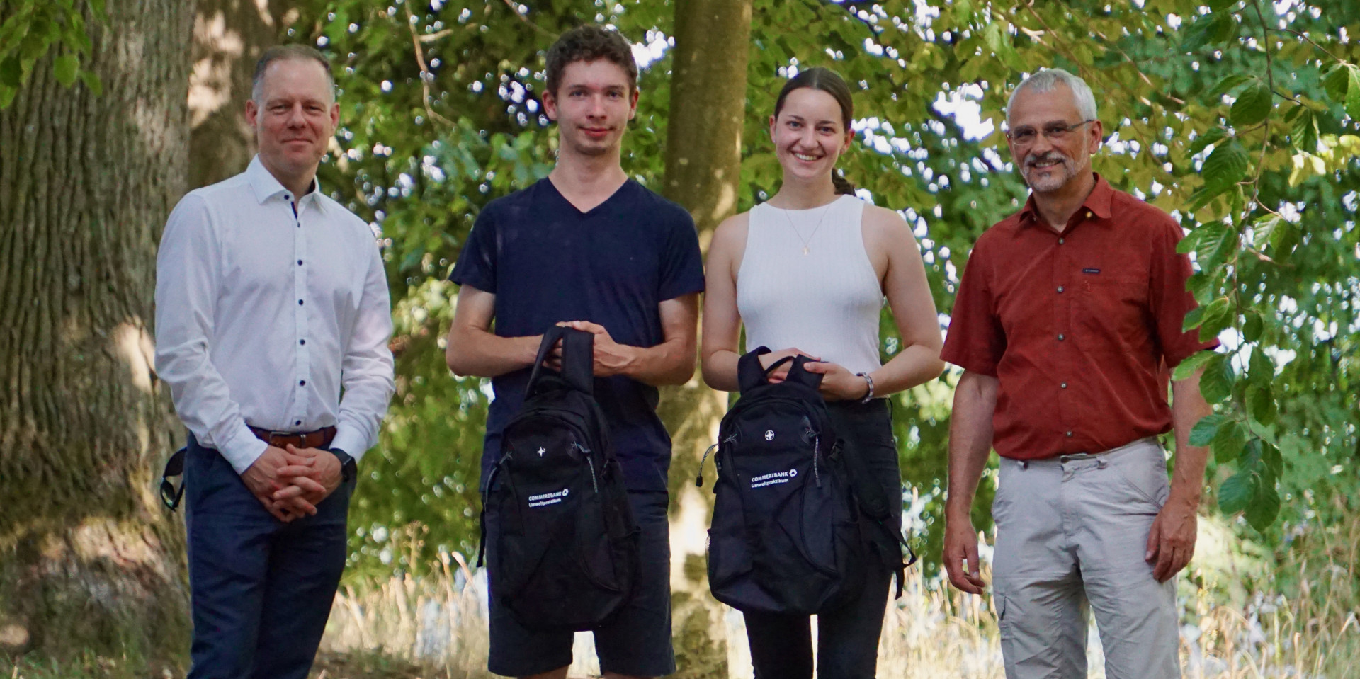 Bild: Filialdirektor Knut Heineken mit den Umweltpraktikanten Oscar Bank und Svenja Hartmann (Regina Gruber nicht auf dem Bild) und Ulrich Meßner, Leiter des Nationalparkamts (v.l.n.r.) bei der Rucksackübergabe.