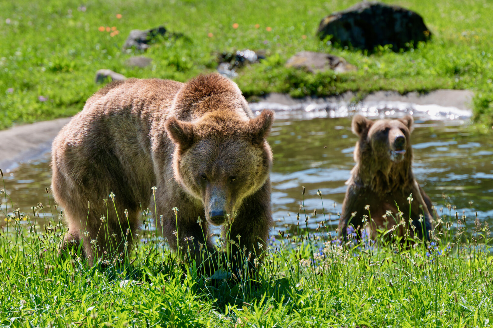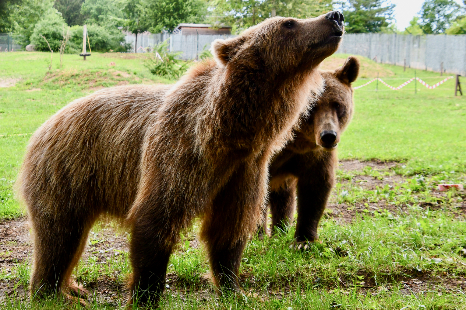 Baden, klettern, buddeln: Die Braunbärenschwestern Dasha und Lelya haben sich rund einen Monat nach ihrem Umzug vom ukrainischen Bärenwald Domazhyr in den Bärenwald Müritz gut eingelebt. Dazu beigetragen haben sicherlich auch die Maßnahmen, die während der Eingewöhnungsphase ergriffen wurden: In den ersten Tagen wurde der Besucherweg weiträumiger um das Gehege herumgeführt, so dass die beiden Bären sich in aller Ruhe mit ihrer neuen Umgebung anfreunden konnten. Inzwischen sind die Braunbärinnen ganz entspannt und können beobachtet werden, wie sie gemeinsam unter schattigen Bäumen ruhen, wie Dasha auf Bäume klettert oder wie beide baden, ihr Futter suchen und neue Beschäftigungsmöglichkeiten erkunden.