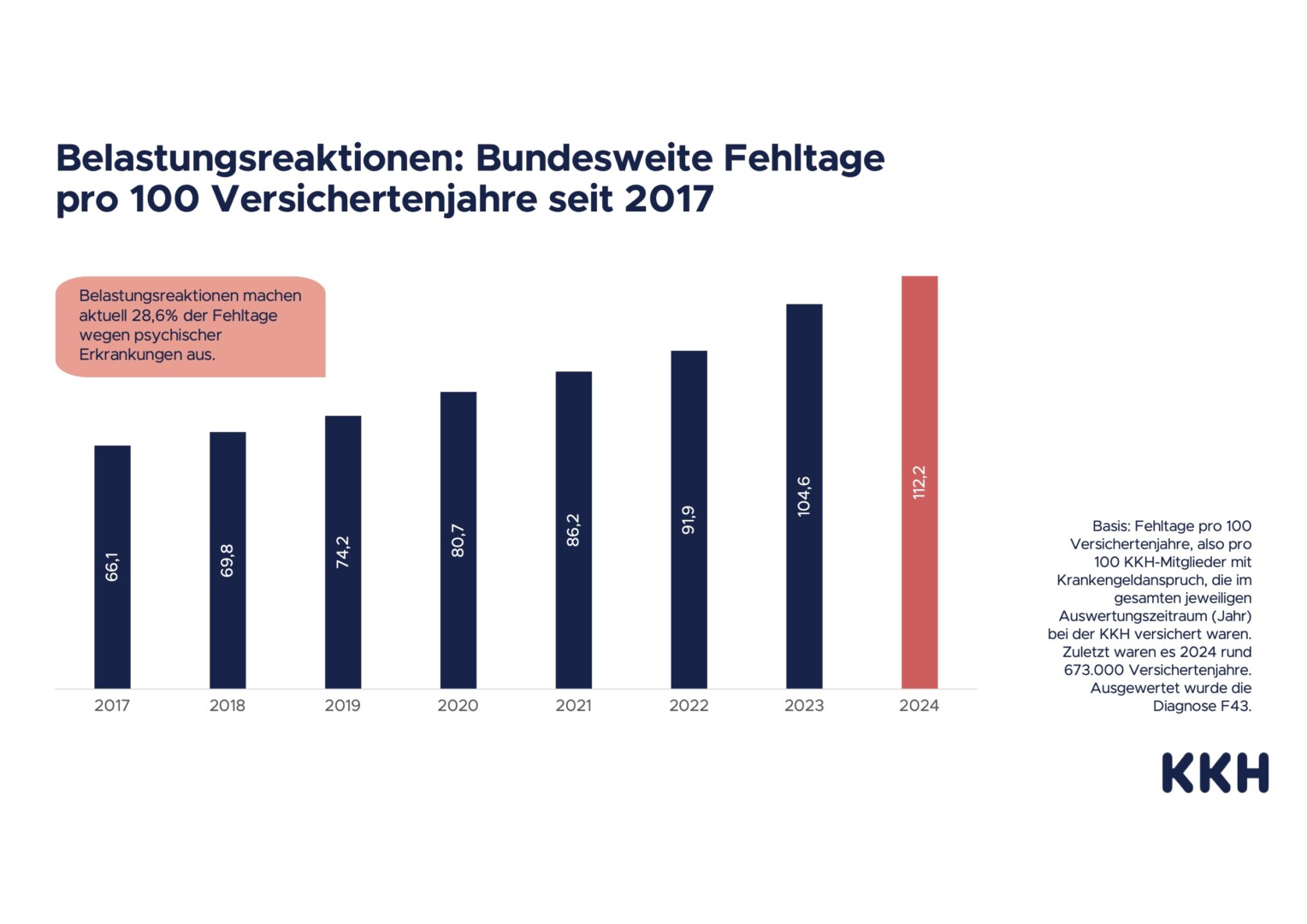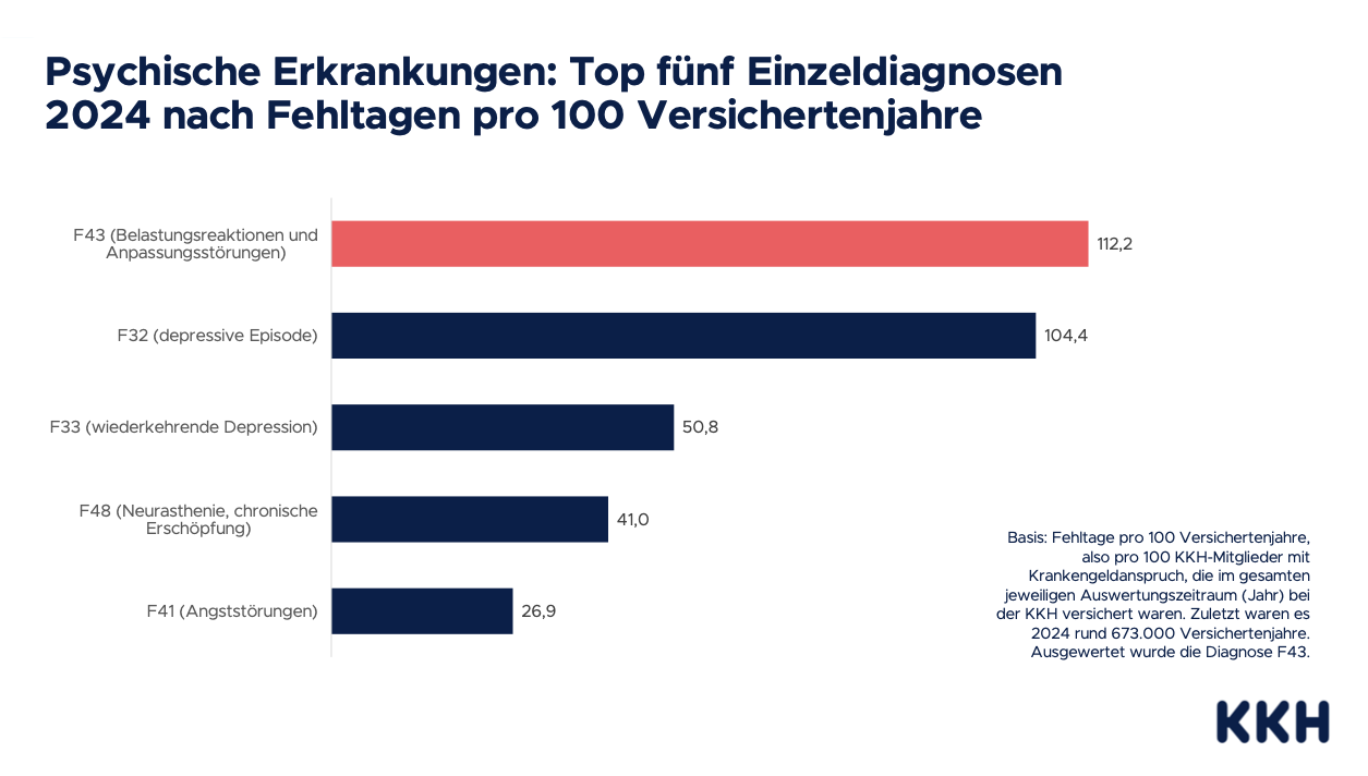 Das größte Plus im Fünfjahres-Vergleich verzeichnet die KKH mit gut 71 Prozent in Schleswig-Holstein, das geringste mit 34 Prozent in Rheinland-Pfalz. Mit Blick auf die Fehlzeiten rangiert der Nordosten mit seinen 145 Tagen pro 100 Berufstätige wiederum deutlich über dem Bundesdurchschnitt von rund 112 Tagen. Im Saarland registriert die KKH 2024 die meisten Ausfalltage wegen Dauerstress (fast 176 Tage), in Baden-Württemberg die wenigsten (gut 81 Tage).
