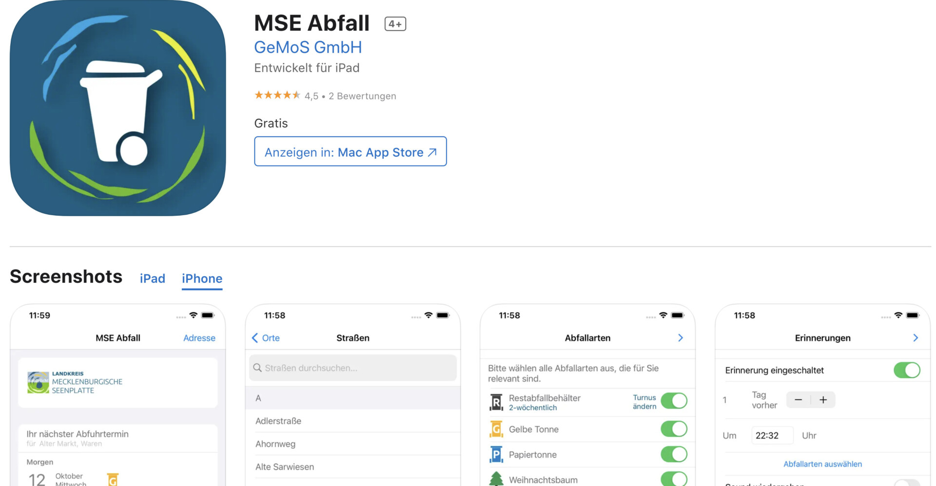 Das Umweltamt des Landkreises Mecklenburgische Seenplatte hat die App „Abfall MSE“ entwickelt, die ab sofort allen Bürgern des Landkreises zur Verfügung steht. Sie bietet eine schnelle und komfortable Möglichkeit, viele Angelegenheiten rund um die Abfallentsorgung zu erledigen. Mit der App kann der individuelle Tourenplan für Restmüll, gelbe und blaue Tonne sowie die Biotonne erstellt werden. Zusätzlich kann eine Erinnerungsfunktion eingerichtet werden, die nach Wahl ein bis drei Tage vor der Leerung zu einer frei wählbaren Uhrzeit an das Rausstellen der Tonne erinnert. Das hat auch den Vorteil, dass feiertagsbedingte Verschiebungen von Abfuhr-Terminen nicht übersehen werden können.
