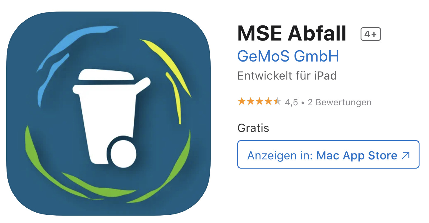 Die App „Abfall MSE“ kann ab sofort über den App Store (iOS) oder Google Play Store auf das mobile Endgerät installiert werden. Zu finden ist die App über die Suchworte „Abfall MSE“ oder „SE Abfall“.