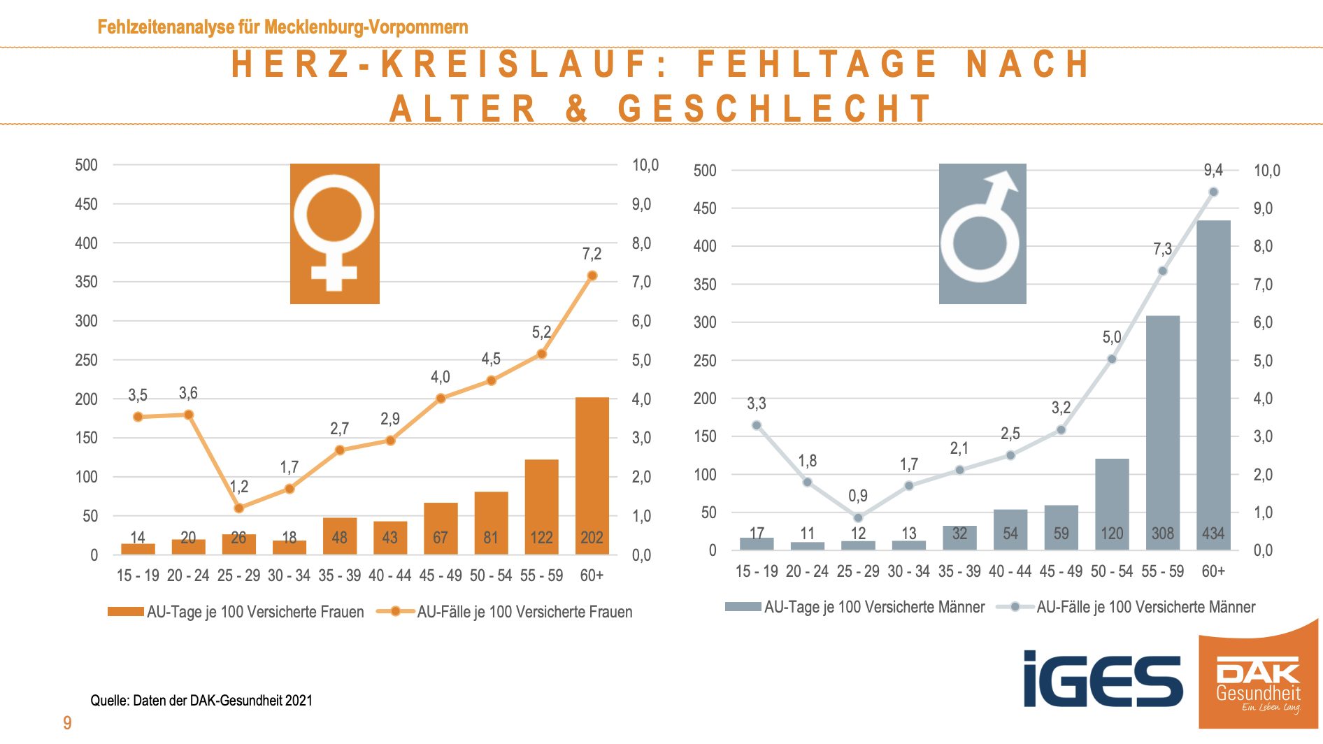 Herz-Kreislauf-Erkrankungen verursachen im Durchschnitt 78 Fehltage im Jahr je 100 Versicherte – bei den Männern mehr, bei den Frauen weniger. Mit dem Alter steigt die Anzahl der Fehltage deutlich an. 45- bis 49-jährige Männer bringen es je 100 Versicherte auf 59 Fehltage, bei ihren zehn Jahre älteren Kollegen sind es 308 Tage –mehr als fünfmal so viele. DAK-Landeschefin Hansen sieht Firmen in der Pflicht, Stress, Belastung und die psychische und physische Gesundheit ihrer Arbeitnehmerinnen und Arbeitnehmer im Blick zu haben und zu schützen.