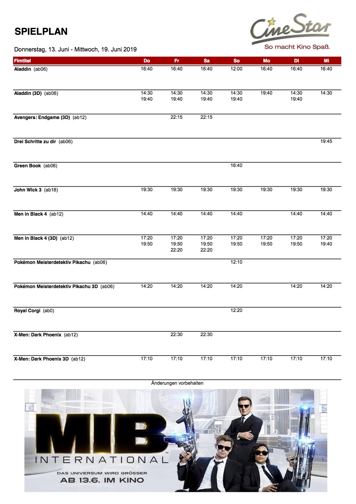Der ab heute gültige Spielplan des CineStar in Waren mit dem Neustart „Men in Black: International“ und den Sondervorstellungen CineLady am 19.06 um 19:45 Uhr mit „Drei Schritte zu dir“ sowie CineExtra am 16.06 um 16:40 Uhr mit „Green Book“.
