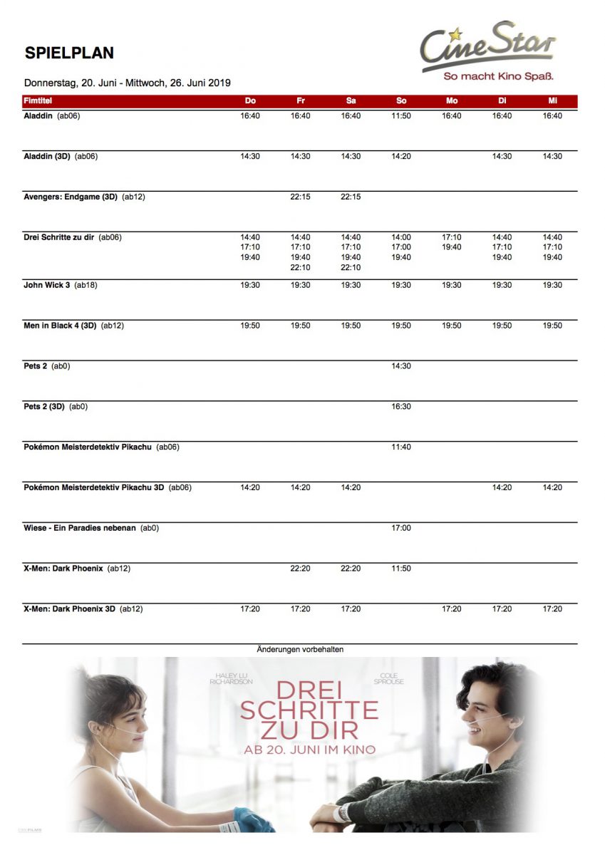 Der aktuelle Spielplan des CineStar Waren mit folgendem Neustart: „Drei Schritte zu dir“ und folgenden Sondervorstellungen: