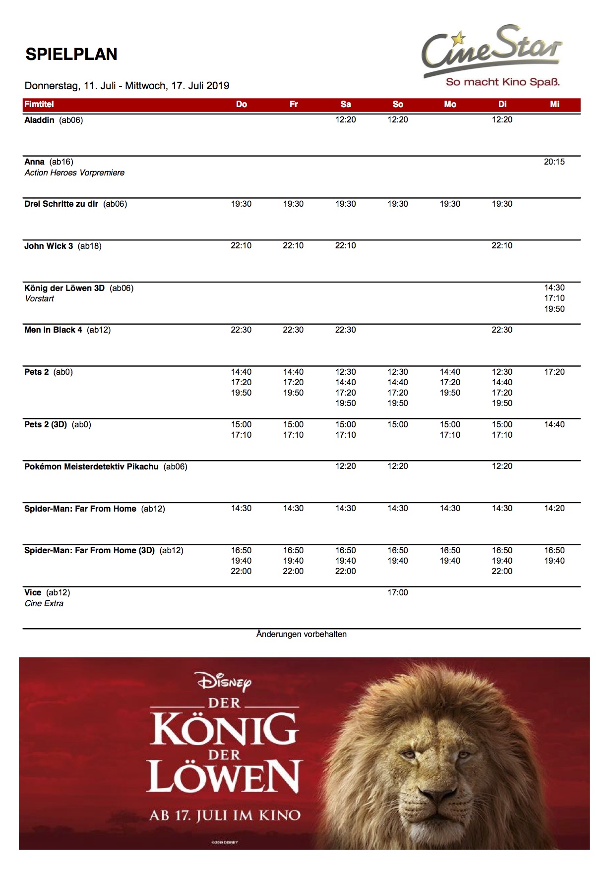 Mittwoch, 17.07 Vorstart „König der Löwen“ 3D 14:30, 17:10 & 19:50 Uhr