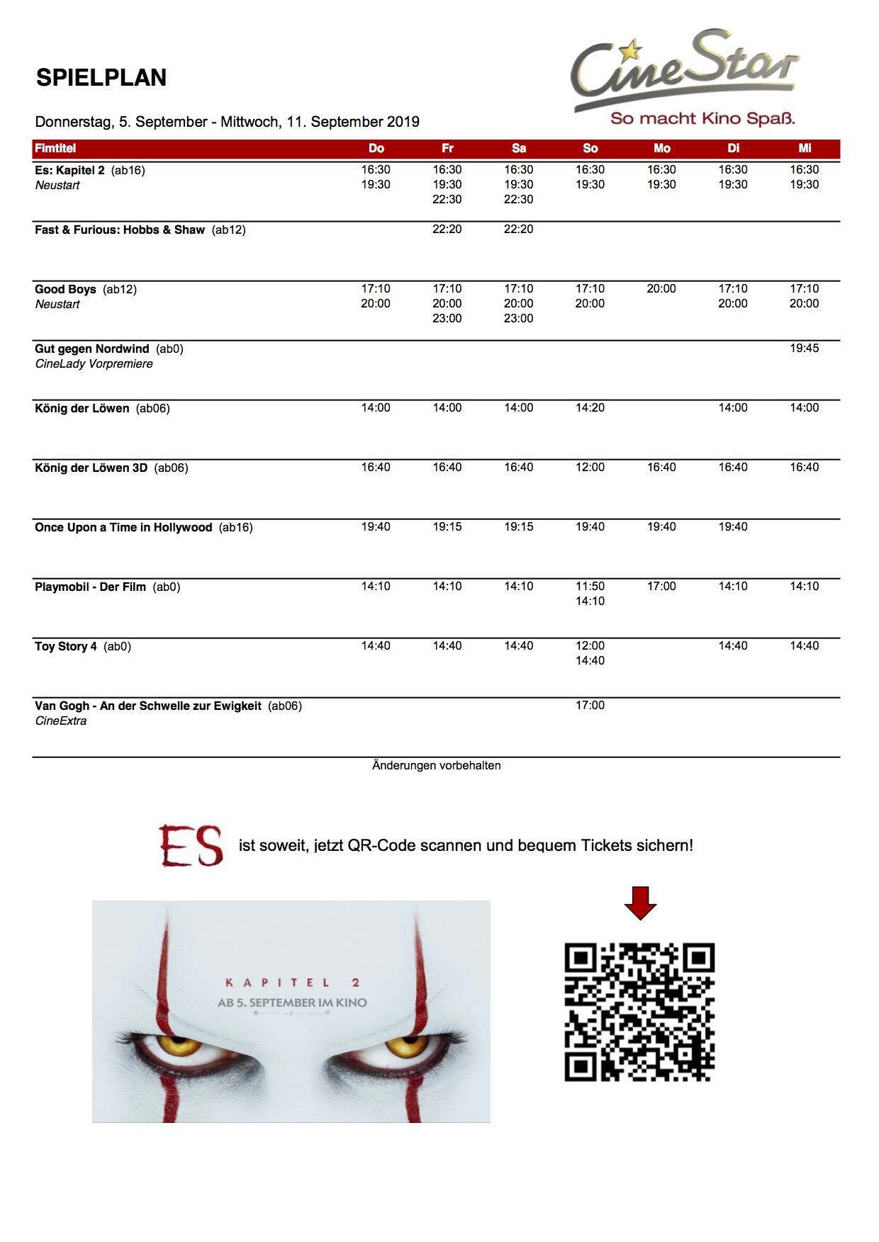 Der ab heute gültige Spielplan des CineStar in Waren mit