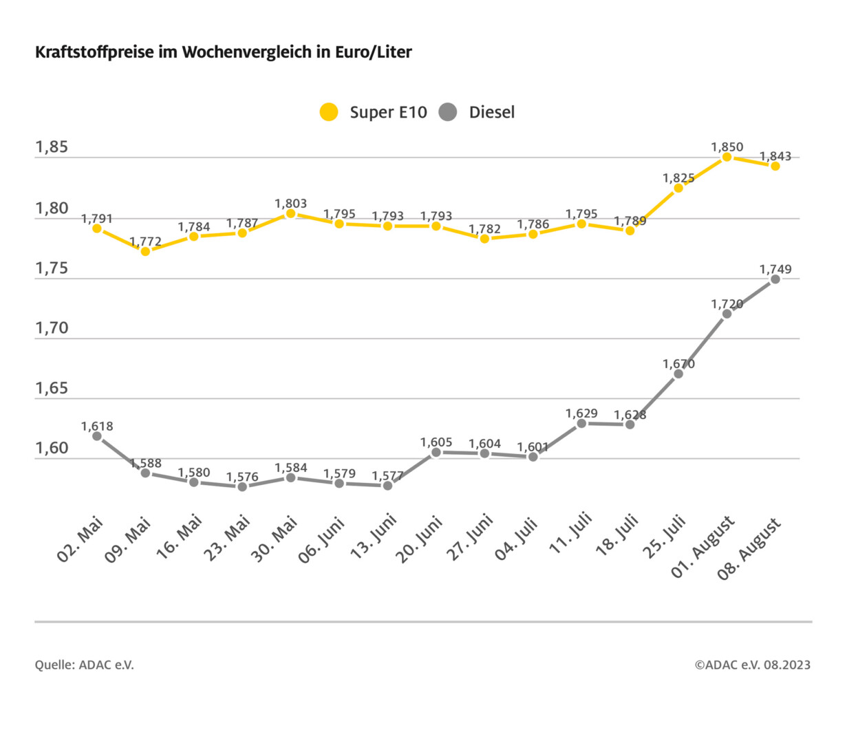 Dieselfahrer müssen derzeit regelmäßig spürbar höhere Preise verkraften. Innerhalb von nur vier Wochen ist der Diesel-Preis um zwölf Cent gestiegen. Wie die aktuelle ADAC Auswertung der Kraftstoffpreise in Deutschland zeigt, kostet ein Liter Diesel im bundesweiten Mittel zurzeit 1,749 Euro. Gegenüber der Vorwoche bedeutet dies einen Anstieg von 2,9 Cent. Gesunken ist hingegen der Benzinpreis, wenn auch nur geringfügig.