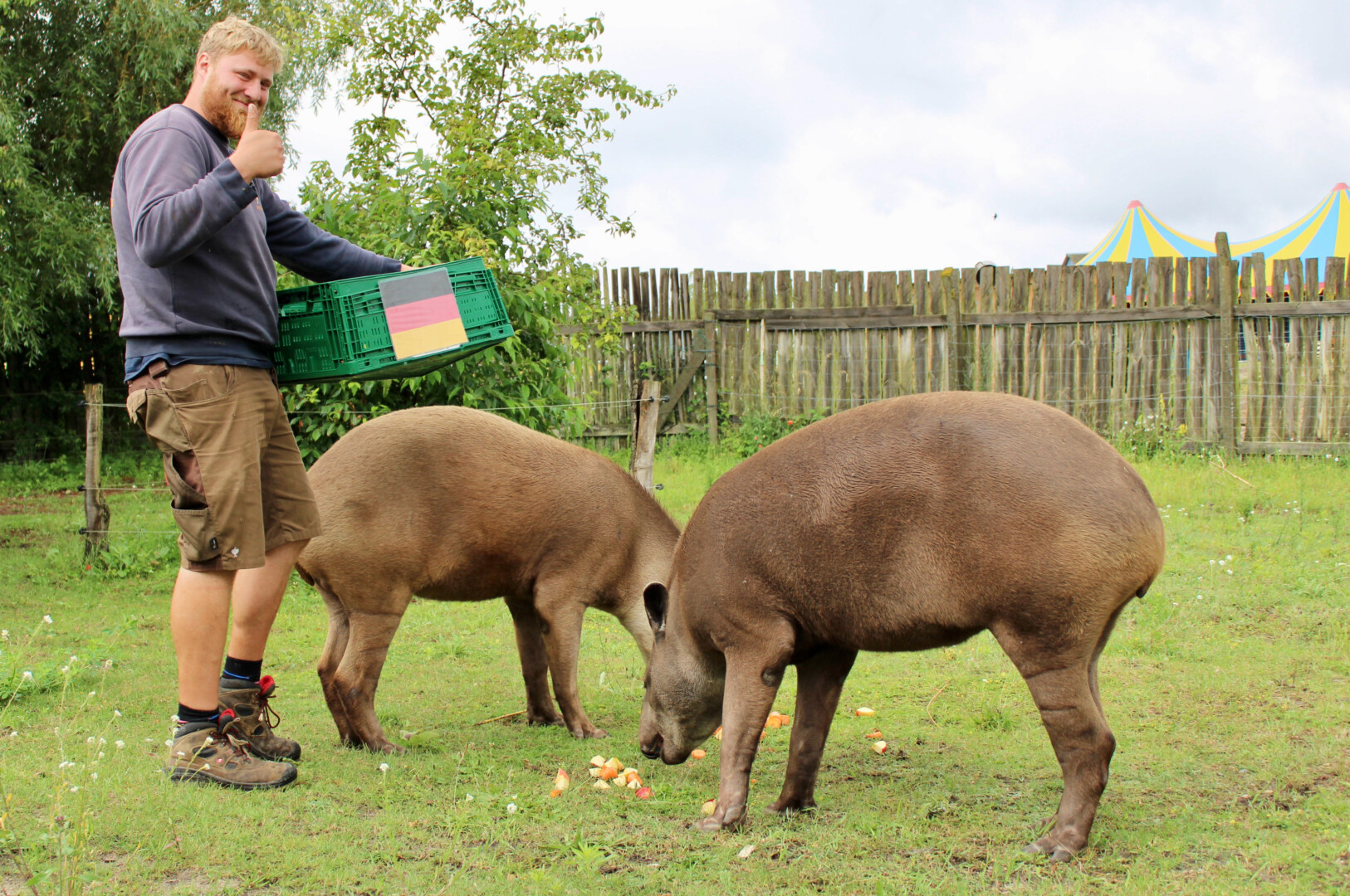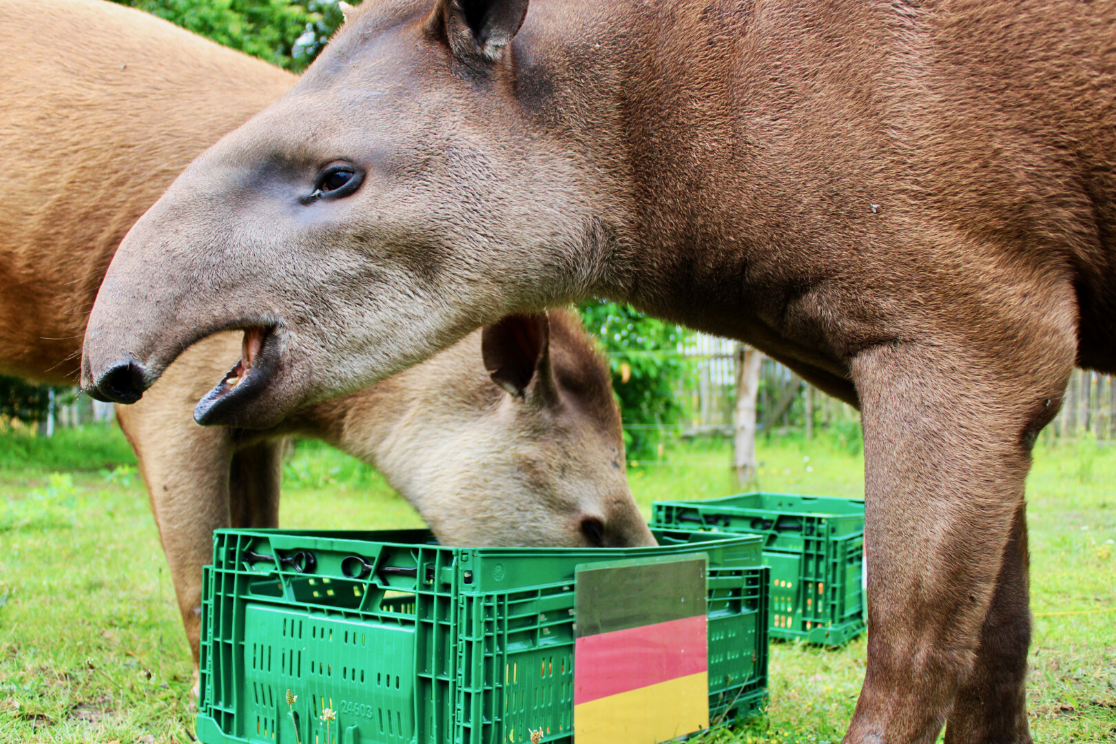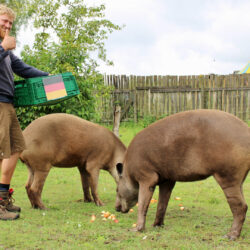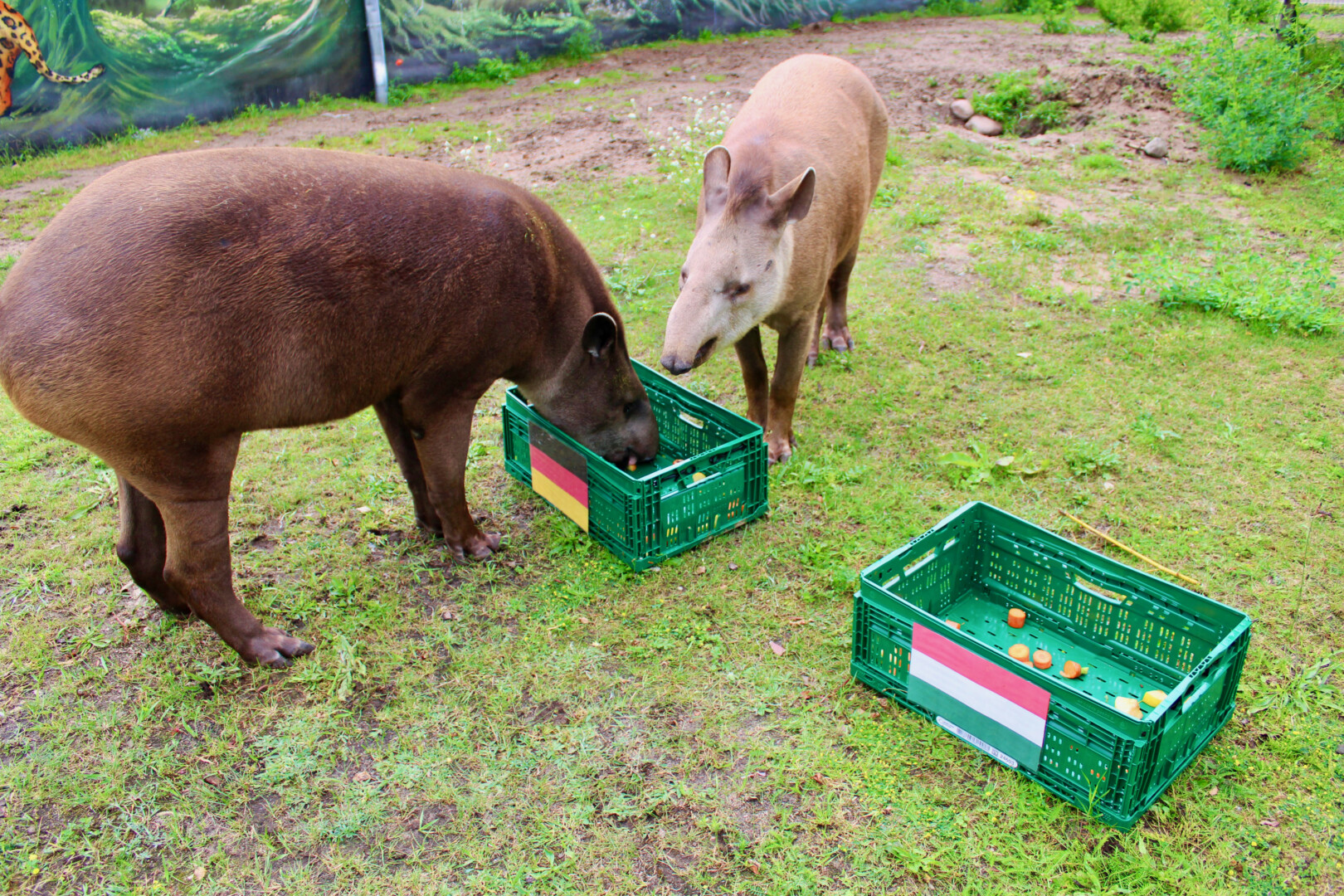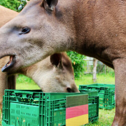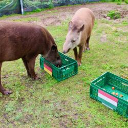 Klare Entscheidung vor dem Spiel Deutschland gegen Ungarn: Die Tapire Pablo und Miriam aus dem Tiererlebnispark Grabowhöfe haben sich heute Vormittag trotz Schmuddelwetter wieder als Fan-Tapire geoutet. Die beiden Patentiere der Gemeinde Grabowhöfe fackelten nicht lange und stürzten sich siegessicher auf den Deutschland-Korb. Vor ca. 35 Zuschauern vertilgten die Flachland-Tapire zunächst die Äpfel und Karotten auf der linken Seite.