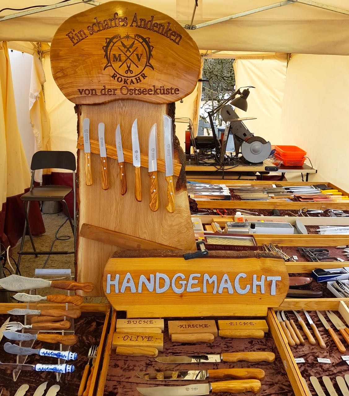 Weitere Mitwirkende: Benny, der Spielemann. An diesen Stand ist anfassen und probieren erlaubt. Bei Klaus gibt es was „Scharfes“ – Messer aus der eigenen Manufaktur. Außerdem bietet er Messerschleifen vor Ort an. Also liebe Müritzer, die stumpfen Messer aus der Schublade ruhig mitbringen.