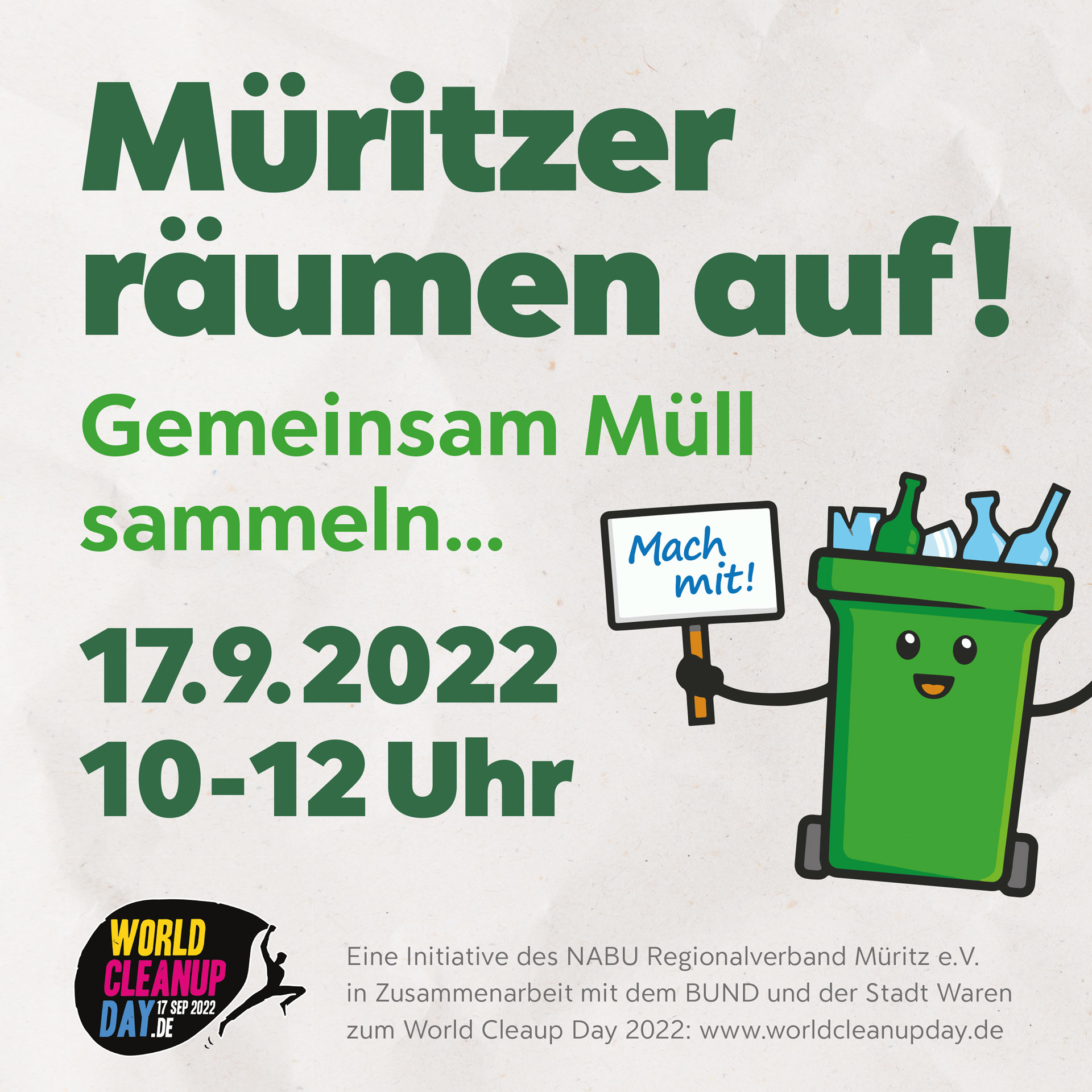 Jedes Jahr am dritten Samstag im September findet der „World Cleanup Day“ statt – die größte Bürgerbewegung der Welt zur Beseitigung von Umweltverschmutzung und Plastikmüll. Der NABU Regionalverband Müritz e.V. organisiert in diesem Zusammenhang am kommenden Sonnabend, 17. September, von 10 bis 12 Uhr eine Müllsammelaktion in Waren unter dem Motto „Müritzer räumen auf“.