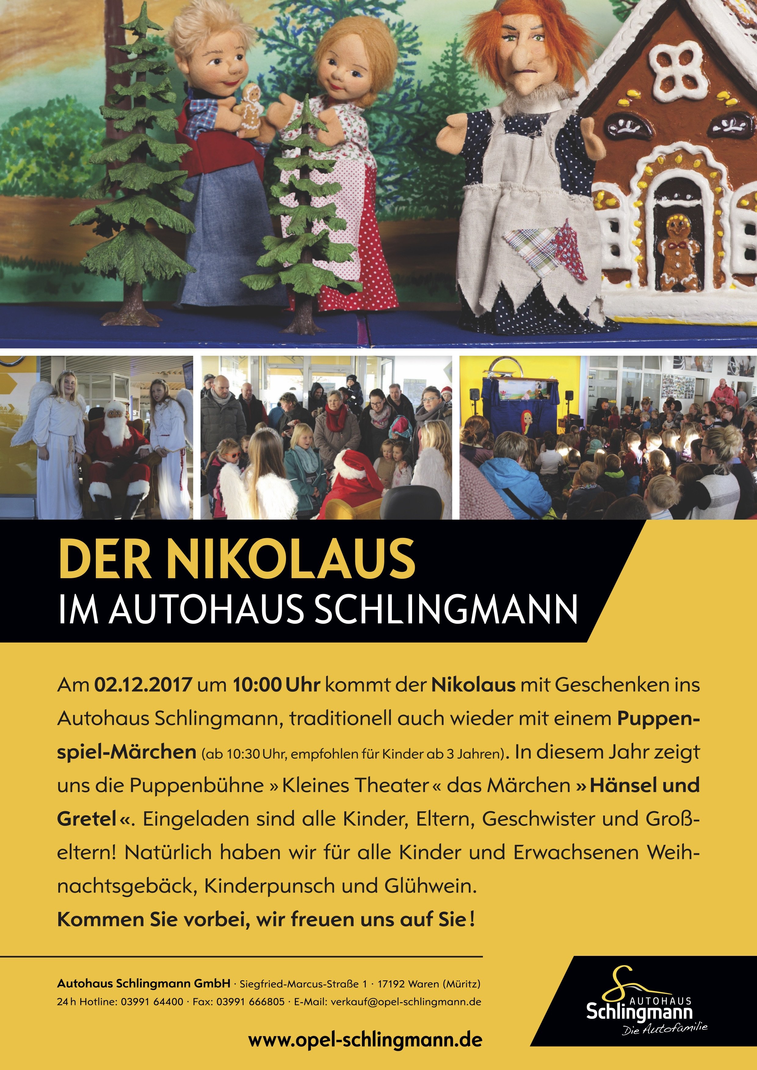 Es ist schon seit vielen Jahren Tradition und auch in diesem Jahr lässt sich der Nikolaus im Opel-Autohaus Schlingmann sehen. Und zwar schon morgen. Er hat sich für 10 Uhr angekündigt und bringt neben kleinen Geschenken auch das Puppenspiel „Hänsel und Gretel“ mit.