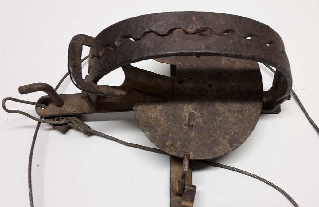 Bei dem Tellereisen, auch Fangeisen genannt, handelt es sich um eine verbotene Falle zum Fang von Raubtieren. Die Klaue eines Tellereisens ist, wie auch im vorliegenden Fall, an einer längeren Metallschnur befestigt. Am Ende jener Schnur befindet sich ein Mechanismus, der an einem starren