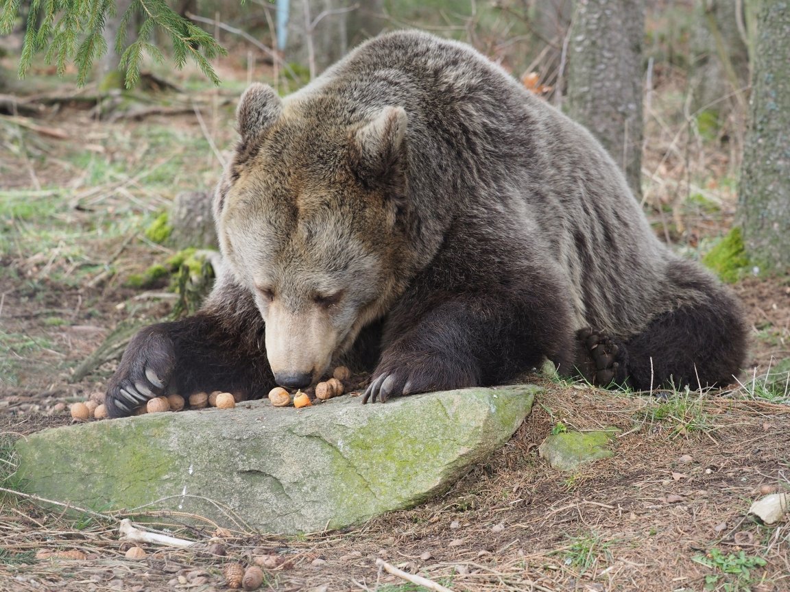 „Bären sind nicht besonders wählerisch. Es können auch ruhig ein wenig ältere Nüsse aus dem Vorjahr sein“, sagt Steinmeier. Beim Knacken der Nüsse entwickeln die nur scheinbar tollpatschigen Tiere eine beeindruckende Geschicklichkeit. „Keine Nuss ist zu ihnen zu hart, jeder noch so kleine Krümel wird von den Tatzen aus der Schale gekratzt“, berichtet die Cheftierpflegerin. Die 16 Schützlinge im Bärenwald Müritz haben in den letzten Wochen schon ein wenig an Gewicht zugenommen. 12 bis 15 Kilo Futter bekommt ein Bär derzeit pro Tag. Neben Nüssen auch Brot, Honig und frisches Obst und Gemüse.