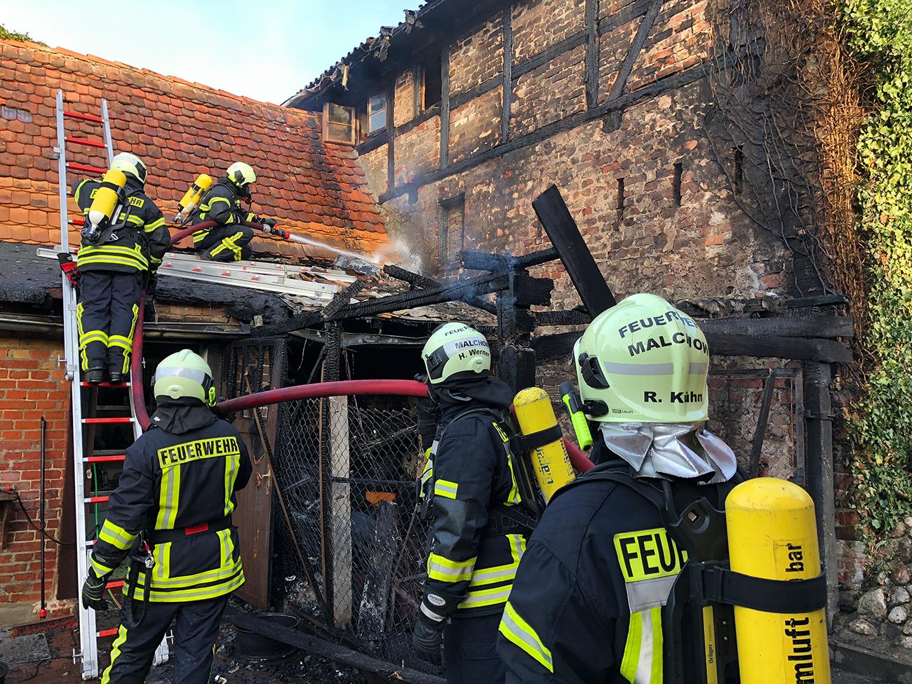 In dem Gebäude verbrannten nach Feuerwehrangaben neben Rasenmähern, Reifen und Felgen auch ein Moped. Den ersteintreffenden Feuerwehren gelang es aber innerhalb weniger Minuten, das Feuer einzudämmen und ein Übergreifen auf das Hauptgebäude zu verhindern. „Das war wirklich in letzter Sekunde. Schon auf Anfahrt sahen wir eine große schwarze Rauchwolke. Die Flammen loderten meterhoch in den Himmel“, sagte uns der Wehrführer der Freiwilligen Feuerwehr Malchow, Heiko Delph.