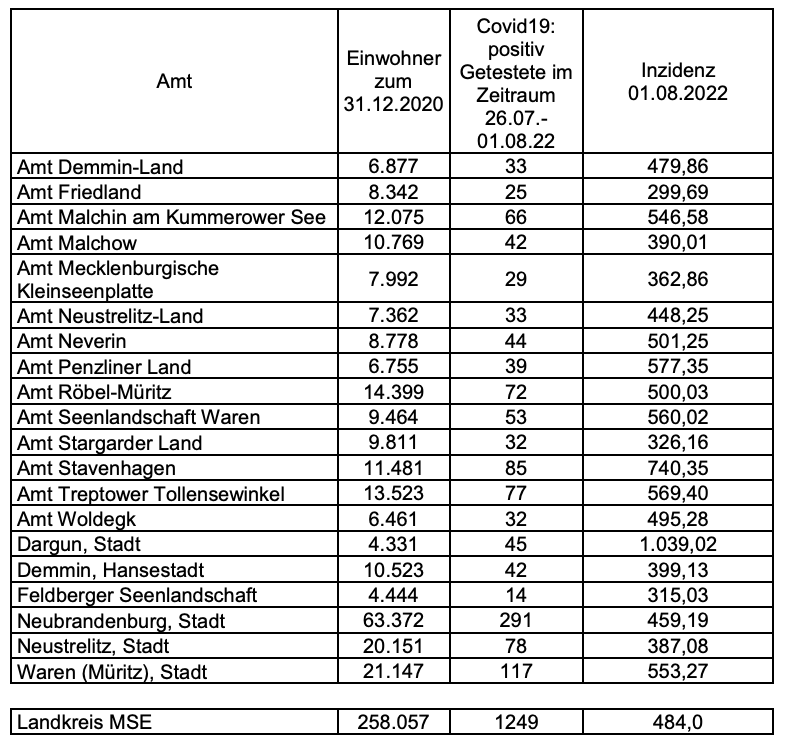 Das Amt Malchow meldete eine Inzidenz von 390,01, das Amt Penzliner Land von 577,35, das Amt Röbel Müritz von 500,03 das Amt Seenlandschaft Waren von 560,02 und die Stadt Waren von 553,27.