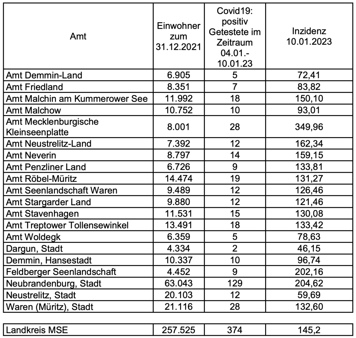 Das Amt Malchow meldete eine Inzidenz von 93,01, das Amt Penzliner Land von 133,81, das Amt Röbel Müritz von 131,27, das Amt Seenlandschaft Waren von 126,46 und die Stadt Waren von 132,60.