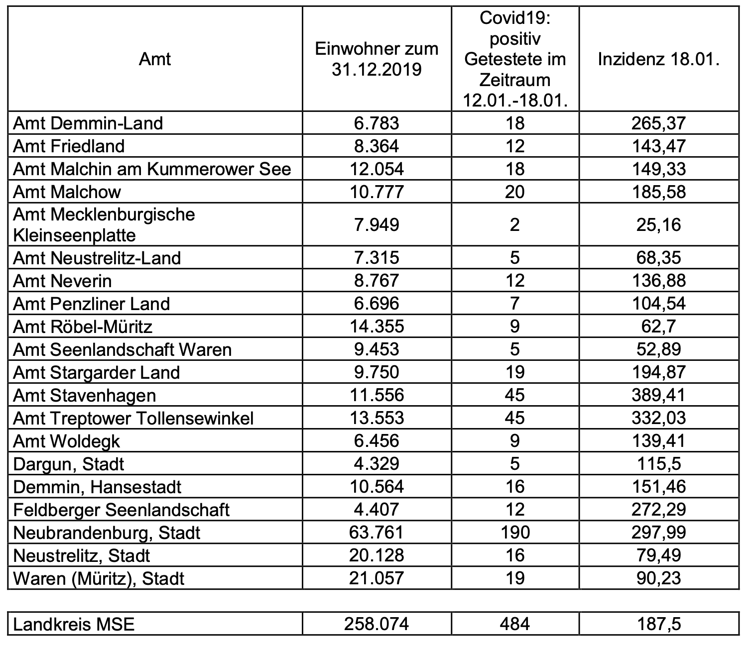 Der Landkreis Mecklenburgische Seenplatte hat heute wieder die Corona-Zahlen aufgeschlüsselt nach Städten und Ämtern bekanntgegeben. Demnach verzeichnet das Amt Stavenhagen in der Woche vom 12. bis 18. Januar mit 389,41 die höchste Inzidenz, gefolgt vom Amt Treptower Ollensewinkel mit 332,03.