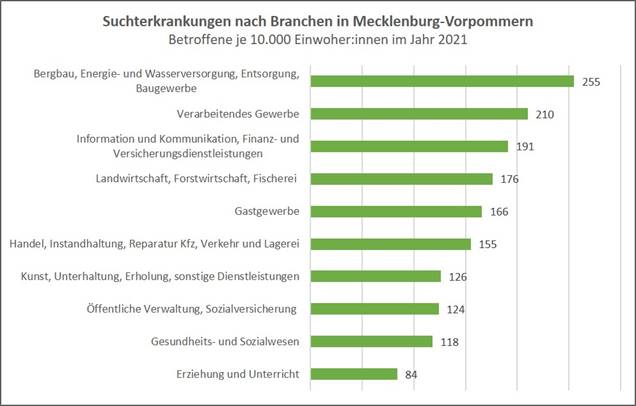 Die Gefahr einer Suchterkrankung ist in Mecklenburg-Vorpommern für Beschäftigte im Baugewerbe sowie im verarbeitendem Gewerbe besonders hoch. Das geht aus dem Morbiditäts- und Sozialatlas des Barmer Instituts für Gesundheitssystemforschung (bifg) hervor. Demnach lag die Rate für eine Suchterkrankung im Zusammenhang mit Alkohol, Drogen oder Medikamenten bei Beschäftigten der Branche Bergbau, Energie- und Wasserversorgung, Entsorgung und Baugewerbe im Jahr 2021 bei 255 Fällen pro 10.000 Einwohner (Bund: 168 Fälle). Dahinter folgen Beschäftigte in Industriebetrieben des verarbeitendem Gewerbes mit 210 Fällen (Bund: 138 Fälle). Am geringsten ist landesweit das Risiko einer Abhängigkeit in Berufen für Erziehung und Unterricht mit rund 84 Fällen. Hier fällt die Betroffenheit sogar etwas geringer aus als der Bundesdurchschnitt von 86 Betroffenen je 10.000.