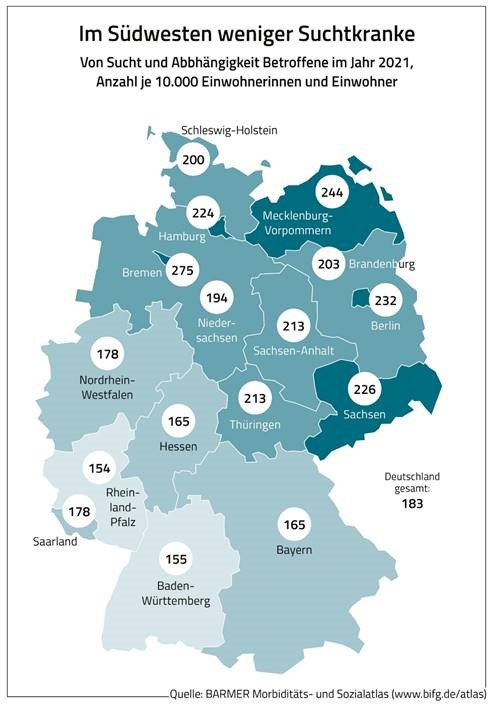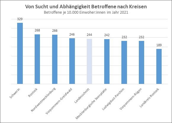 Der Analyse der Barmer zufolge fallen die übergreifenden Raten von Suchterkrankungen regional sehr unterschiedlich aus. So ist Mecklenburg-Vorpommern bundesweit das Flächenland mit der höchsten Betroffenheit von 244 Suchterkrankten je 10.000 Einwohnern. Die Rate liegt mehr als 30 Prozent über dem Bundesschnitt von 183 Betroffenen je 10.000 Einwohnern. Die geringste Betroffenheit bundesweit gibt es in Rheinland-Pfalz mit 154 Fällen je 10.000 Einwohnern. „Die hohe Rate von Drogen- und Alkoholabhängigkeit in Mecklenburg-Vorpommern ist ein erschreckendes Ergebnis. Es bedarf tiefergehender Analysen, welche spezifischen Gründe es für die hohe Betroffenheit im Land gibt sowie präventive Angebote, um Suchterkrankungen vorzubeugen“, so Henning Kutzbach. Auf Kreisebene sei die Landeshauptstadt Schwerin bundesweit trauriger Spitzenreiter bei den Suchterkrankungen mit 329 Fällen je 10.000. In keinem anderen Landkreis beziehungsweise keiner anderen kreisfreien Stadt innerhalb Deutschlands falle die Betroffenheit so hoch aus wie in Schwerin.