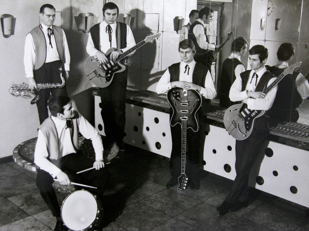 Atlantics im Bahnhofs-Hotel Waren ab 1966 bis ca 1970 (v. links Fritz Weiss-Sax+Ges., Spargel-Git.+Ges., Gerd Finger-Bass+Ges., Peter Arndt Solo-Git., vorn unten Joachim Harnisch Schlagzeug)