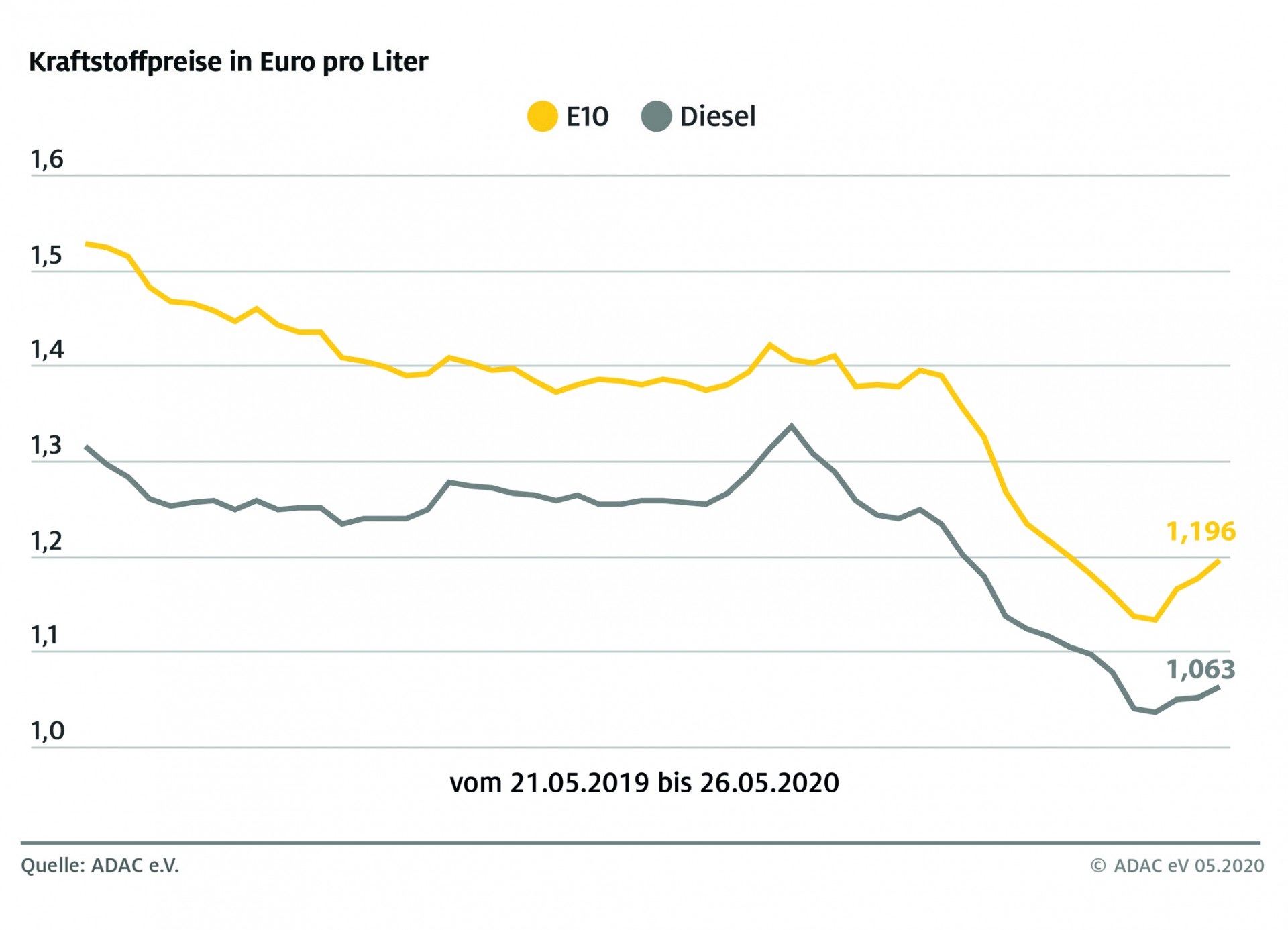 Die Zeit sinkender Kraftstoffpreise scheint vorbei. Laut aktueller Auswertung des ADAC müssen Autofahrer für einen Liter Super E10 im Bundesdurchschnitt 1,196 Euro bezahlen, das sind 1,9 Cent mehr als in der Vorwoche. Diesel verteuerte sich um 1,1 Cent auf durchschnittlich 1,063 Euro je Liter. Das ist bereits der dritte Wochenanstieg in Folge. Im Vergleich zu den Preisen vor der Coronakrise ist Tanken im Bundesschnitt dennoch rund 10 Cent je Liter billiger.