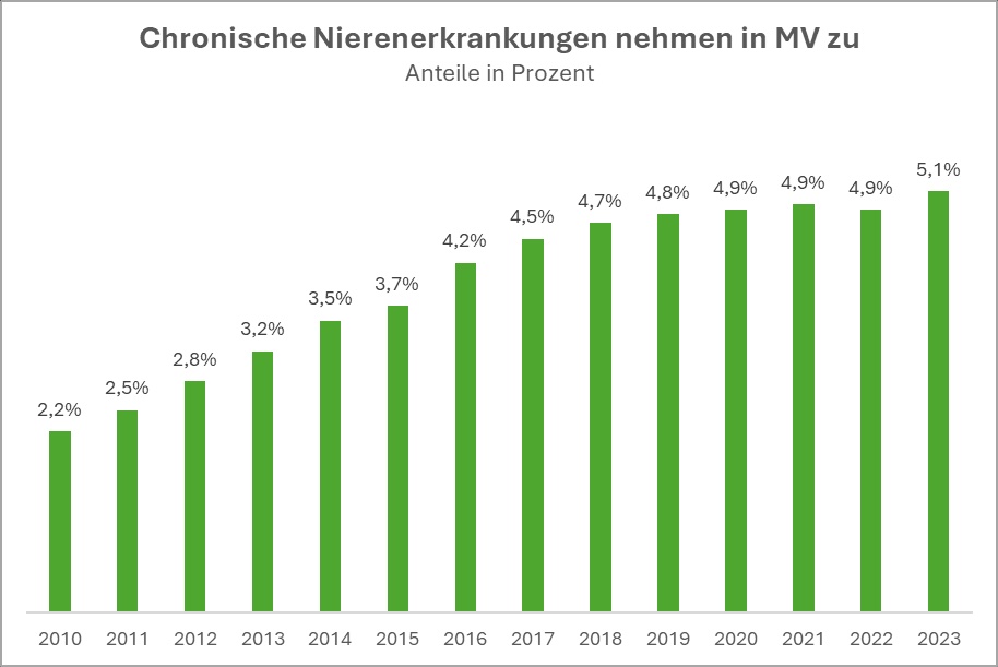 Chronische Nierenerkrankungen bleiben oftmals unbemerkt und betreffen immer mehr Menschen in Mecklenburg-Vorpommern. Eine aktuelle Analyse des Barmer Instituts für Gesundheitssystemforschung zeigt, dass im Jahr 2023 insgesamt 5,1 Prozent der Bevölkerung in Mecklenburg-Vorpommern an dieser Krankheit litt. Das entspricht knapp 83.000 Menschen im Land. 2010 lag der Anteil der Betroffenen bei nur 2,2 Prozent. „Gesunde Nieren sind lebenswichtig, da sie das Blut reinigen. Das Problem: Eine chronische Nierenerkrankung bleibt oftmals lange unentdeckt, da Symptome wie Wasseransammlungen, Konzentrationsstörungen oder Abgeschlagenheit selten mit Nierenproblemen in Verbindung gebracht werden“, erklärt Henning Kutzbach, Landesgeschäftsführer der Barmer in Mecklenburg-Vorpommern. Eine gezielte Vorsorgeuntersuchung fehle bisher.