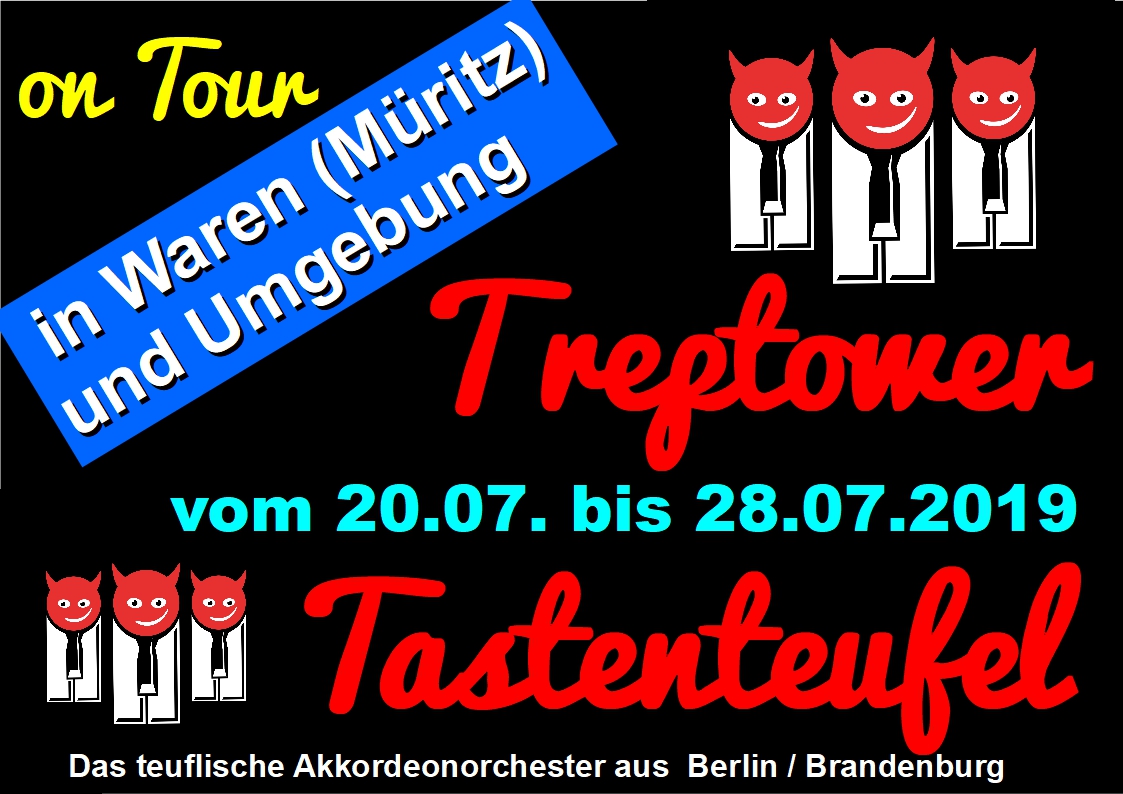 Die Treptower Tastenteufel sind wieder an der Müritz. Das teuflische Akkordeonorchester aus Berlin/Brandenburg gibt ab heute bis zum 28. Juni fünf Konzerte in der Müritz-Region. Aber die lustigen Musiker sind auch bekannt für ihre Spontanität und werden ungeplant mal hier und mal da auftreten. Und dann heißt es: Stimmung! Das haben sie schon einmal an der Müritz bewiesen, als sie beispielsweise mal eben auf dem Neuen Markt in Waren loslegten und innerhalb weniger Minuten ganz viele Zuhörer fanden. Wir freuen uns auf die spontanen Einsätze!