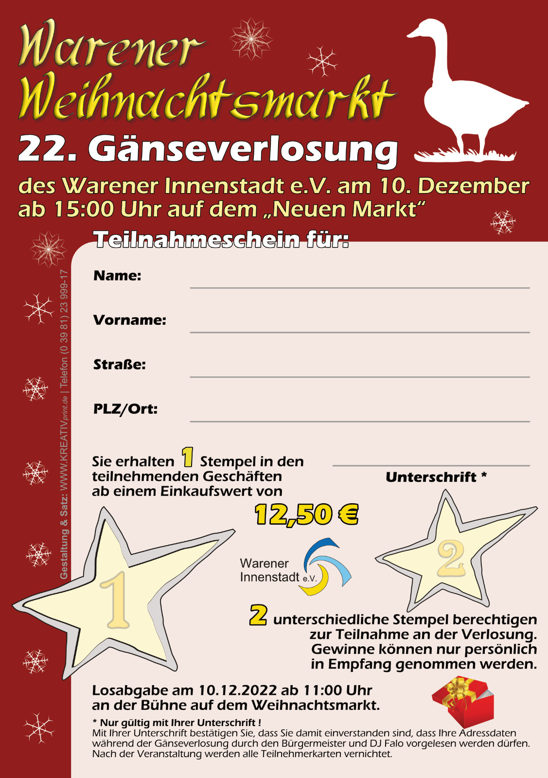 Mitmachen dürfen alle – egal, ob aus Waren oder aus anderen Orten. Doch die potentiellen Gewinner sollten am 10. Dezember ab 15 Uhr bei der Verlosung auf dem Neuen Markt unbedingt dabei sein, denn fehlt ein Gewinner, wird ein neuer gezogen.