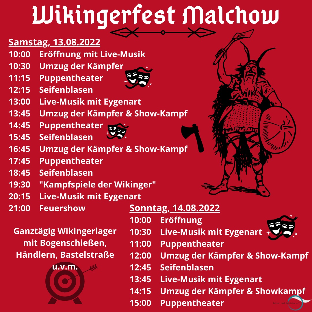 Am kommenden Wochenende besiedeln die Wikinger wieder das Klostergelände in Malchow, um das zweite Malchower Wikingerfest zu feiern. Ein prall gefülltes Programm unter anderem mit Umzügen der Kämpfer samt Showkämpfen, Puppentheater, Livemusik, Feuershow, aber auch ein authentisches Wikingerlager mit Händlern und Handwerkern, Bogenschießen, Kinderschminken und Bastelstraße sowie leckeren gastronomischen Angeboten locken am Sonnabend und Sonntag jeweils ab 10 Uhr auf das Klostergelände.