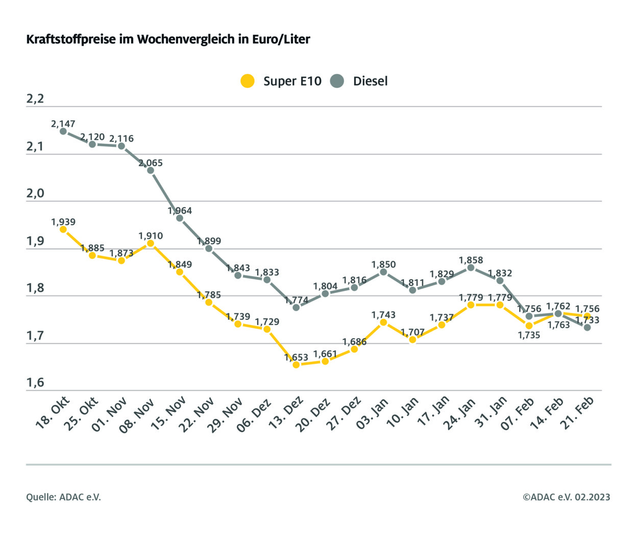 Was sich in der vergangenen Woche erstmals seit über acht Monaten gezeigt hat, bestätigt sich: Diesel bleibt günstiger als Super E10. Beide Kraftstoffsorten sind im Schnitt zudem wegen rückläufiger Rohölnotierungen günstiger als in der Vorwoche. So verzeichnet der ADAC in seinem wöchentlichen Vergleich der Kraftstoffpreise einen Rückgang von 0,7 Cent bei Super E10: Ein Liter kostet damit im bundesweiten Mittel 1,756 Euro.