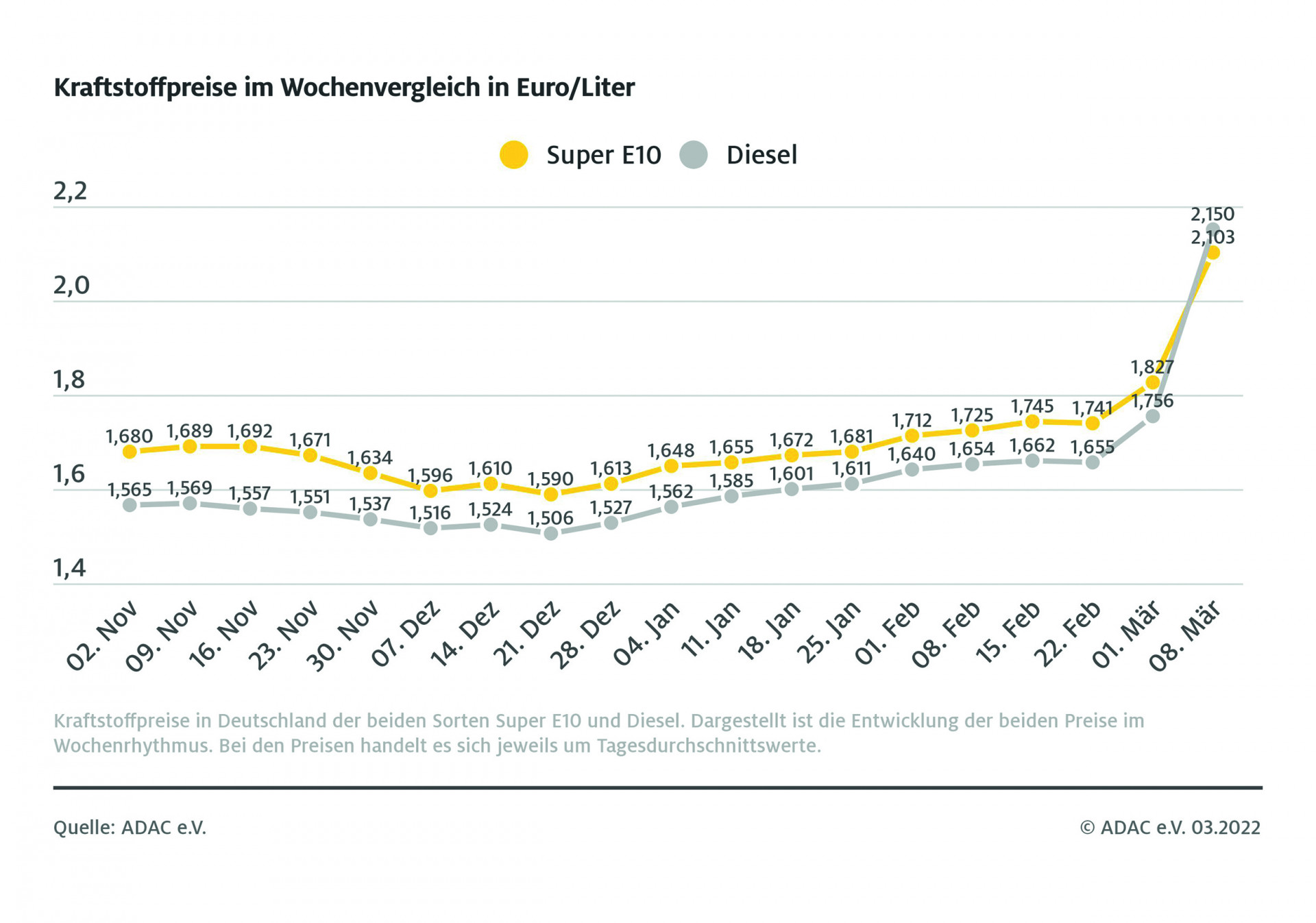 Einen derart gewaltigen Preissprung an den Zapfsäulen gab es in Deutschland noch nie: Binnen einer Woche verteuerte sich Dieselkraftstoff laut aktueller ADAC-Auswertung um 39,4 Cent je Liter und kostet damit im bundesweiten Mittel 2,15 Euro. Auch der Benzinpreis schoss regelrecht durch die Decke. Für einen Liter Super E10 müssen die Verbraucher aktuell 2,103 Euro bezahlen, das sind 27,6 Cent mehr als vor Wochenfrist.