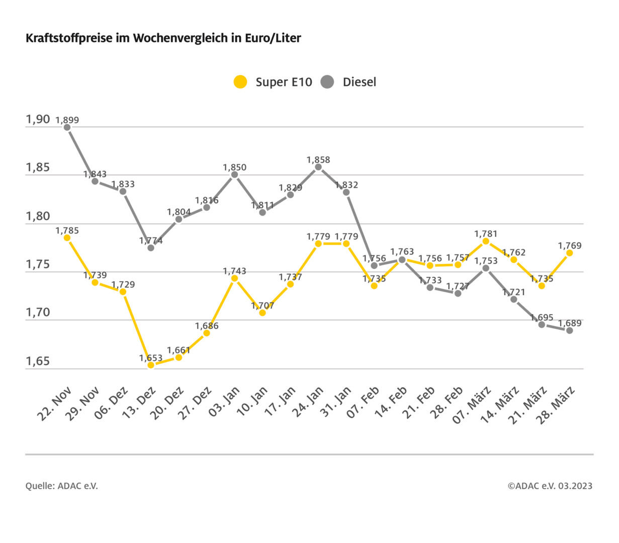 Die Preisdifferenz zwischen Super E10 und Diesel hat sich binnen Wochenfrist verdoppelt und beträgt mittlerweile acht Cent. Dies zeigt die aktuelle ADAC Auswertung der Kraftstoffpreise in Deutschland. Danach kostet ein Liter Super E10 im bundesweiten Mittel 1,769 Euro und damit 3,4 Cent mehr als in der Vorwoche. Diesel ist um 0,6 Cent billiger und kostet aktuell 1,689 Euro je Liter.