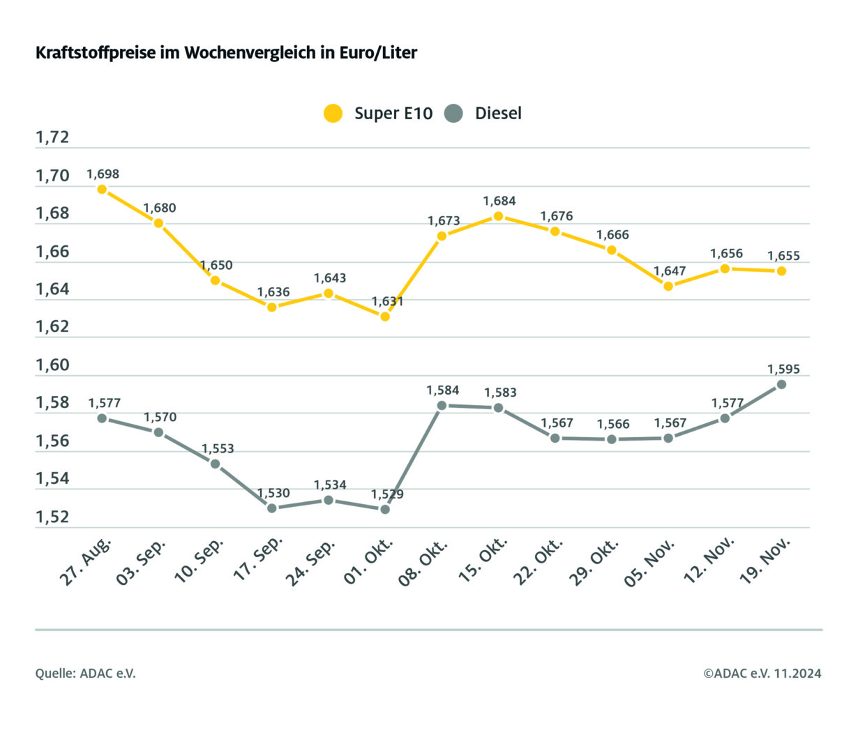 Dass der Dieselpreis in der kalten Jahreszeit teurer wird, ist nicht ungewöhnlich. Diesel-Kraftstoff ist nahezu das gleiche Produkt wie Heizöl, er wird nur anders besteuert. Wenn im Winter die Heizölnachfrage anzieht und für höhere Preis sorgt, dann spüren das auch die Dieselfahrer an der Tankstelle. Der Benzinpreis kann hingegen stabil bleiben. Der Preis für Rohöl als maßgebliche Größe für die Entwicklung der Kraftstoffpreise liegt mit rund 73 US-Dollar je Barrel Brent um etwa einen Dollar über dem Preis von letzter Woche. Der Euro/Dollar-Wechselkurs bleibt weiterhin vergleichsweise schwach bei 1,06 US-Dollar pro Euro.