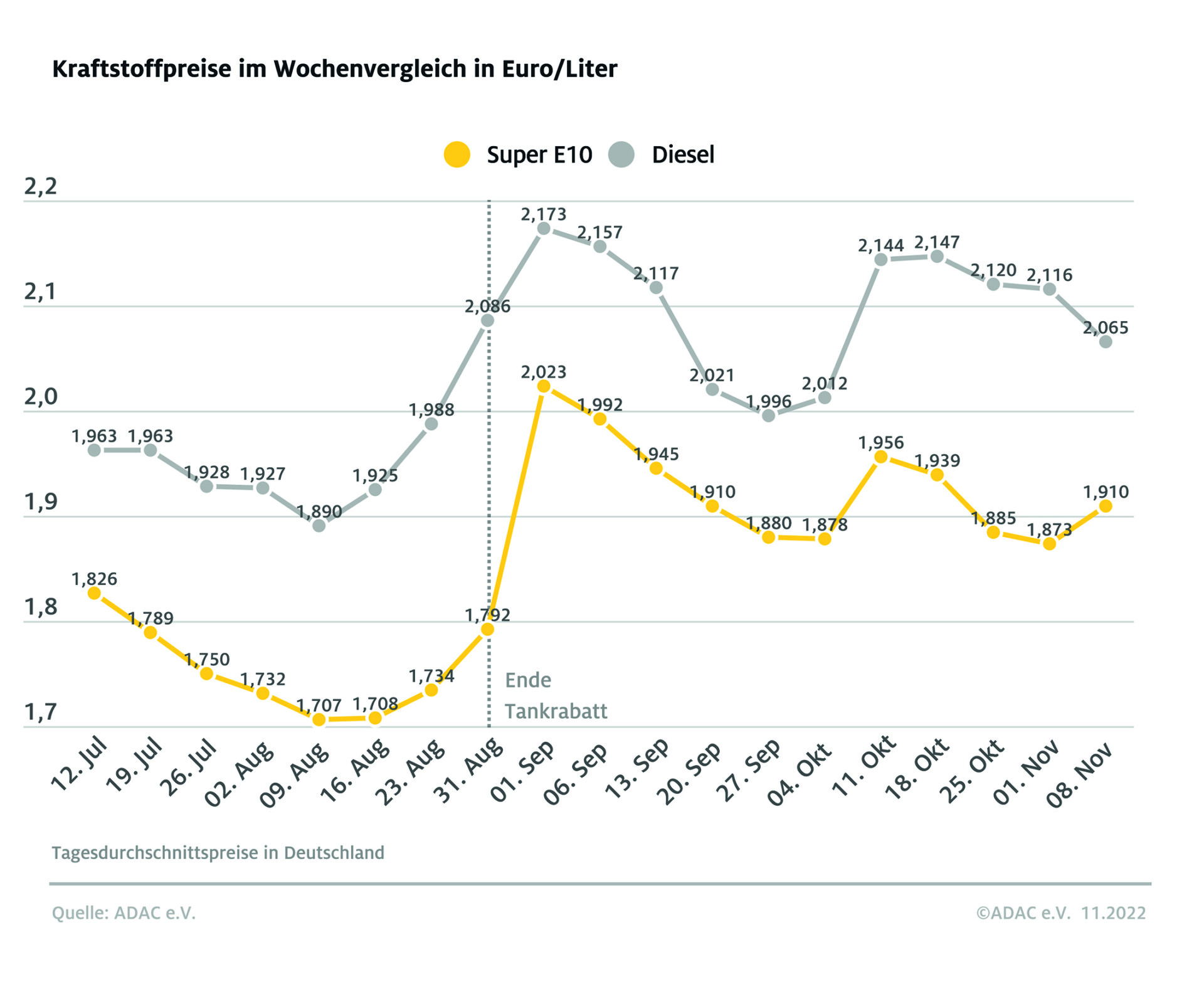 Für die Fahrer von Diesel-Pkw hat sich beim Tanken eine leichte Entspannung bemerkbar gemacht. Der Preis für Diesel-Kraftstoff ist binnen einer Woche laut aktueller ADAC-Auswertung um 5,1 Cent je Liter gesunken und liegt damit im bundesweiten Mittel bei 2,065 Euro. Verteuert hat sich hingegen Benzin: Ein Liter Super E10 kostet 1,910 Euro – ein Anstieg von 3,7 Cent gegenüber der Vorwoche, trotz des im Wochenvergleich kaum veränderten Ölpreises.