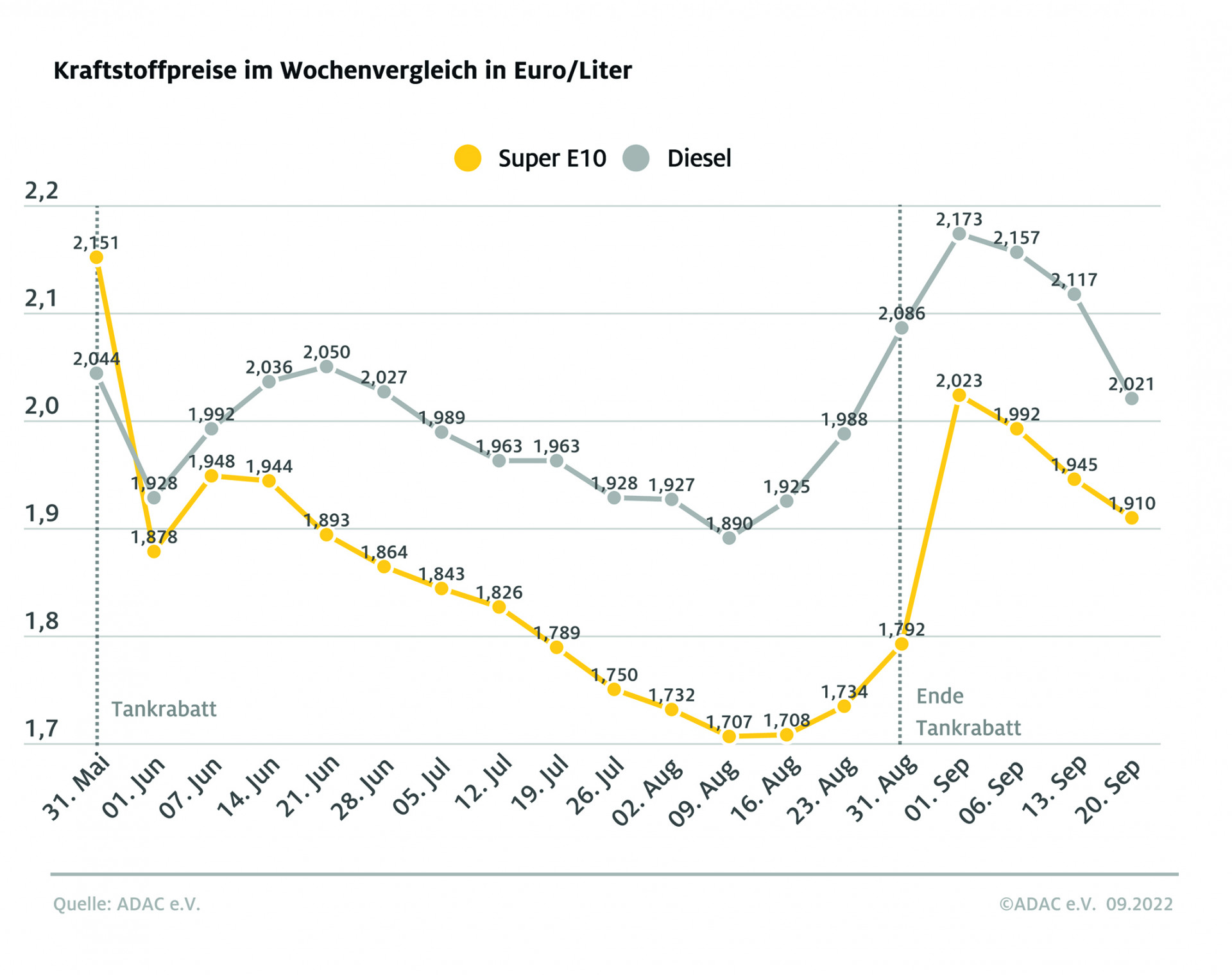 Der Preis für Diesel-Kraftstoff ist seit vergangener Woche kräftig gesunken. Das zeigt die aktuelle ADAC Auswertung der Kraftstoffpreise in Deutschland. Danach sind die Preise für einen Liter Diesel um 9,6 Cent gesunken, so dass dieser im bundesweiten Mittel jetzt 2,021 Euro kostet. Auch der Benzinpreis ist binnen Wochenfrist gefallen, wenn auch in geringerem Maße. Laut ADAC kostet ein Liter Super E10 derzeit im Schnitt 1,910 Euro – ein Minus von 3,5 Cent.