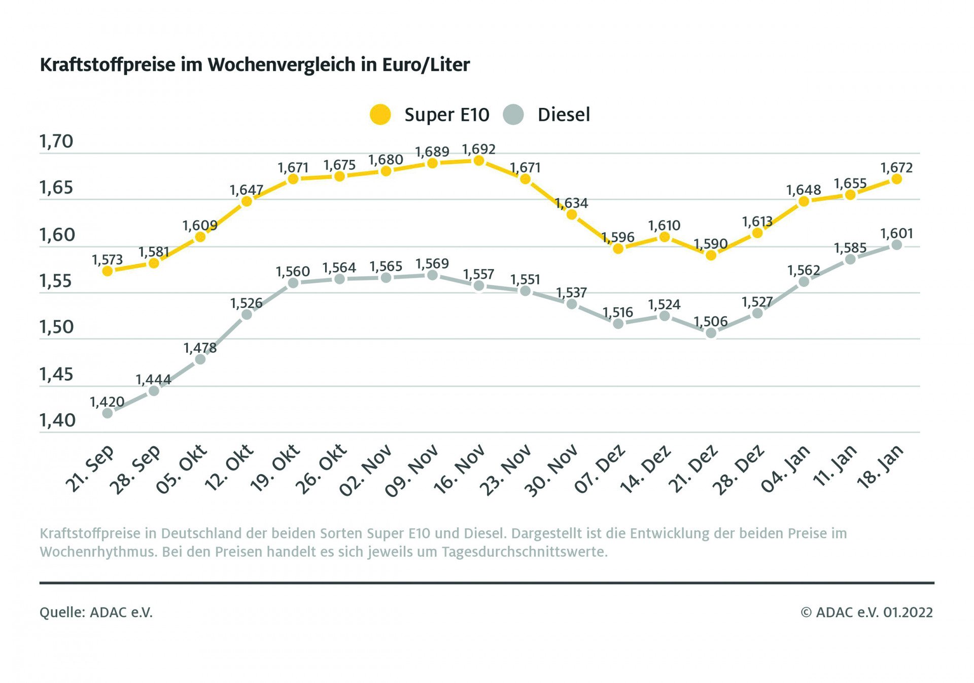 Nie zuvor mussten die Autofahrer in Deutschland mehr für Dieselkraftstoff bezahlen als zurzeit – dies zeigt die aktuelle ADAC Auswertung der Kraftstoffpreise. Danach kostet Diesel derzeit im bundesweiten Schnitt 1,601 Euro je Liter und damit 1,6 Cent mehr als in der Vorwoche. Mit der neuerlichen Verteuerung ist der Dieselpreis zum ersten Mal über die Marke von 1,60 Euro gesprungen.
