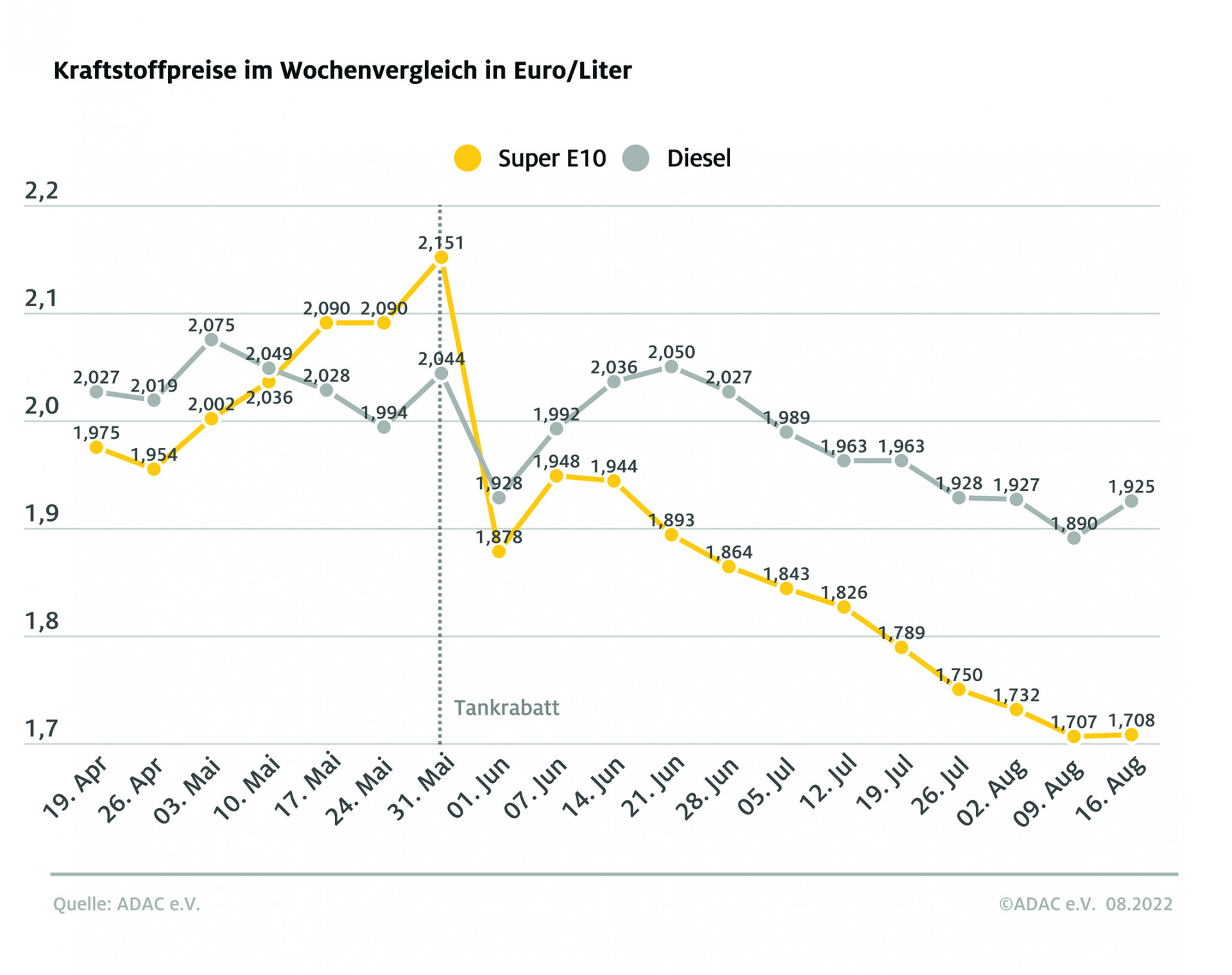 Angesichts des nahenden Endes des Tankrabatts zum 31. August sollten Autofahrer bereits heute die Kraftstoffpreise im Blick behalten und grundsätzlich dann tanken, wenn sich hierfür eine günstige Gelegenheit bietet. Laut ADAC ist es nicht zwangsläufig, dass die Spritpreise pünktlich zum 1. September wieder sprunghaft steigen, weil die Tankstellen ein Interesse daran haben, im August noch niedrigversteuerten Kraftstoff in ihre Tanks zu füllen. Damit können sie sich auch über den 1. September hinaus auf dem Markt mit niedrigen Spritpreisen einen Wettbewerbsvorteil verschaffen oder ihre Margen erhöhen.