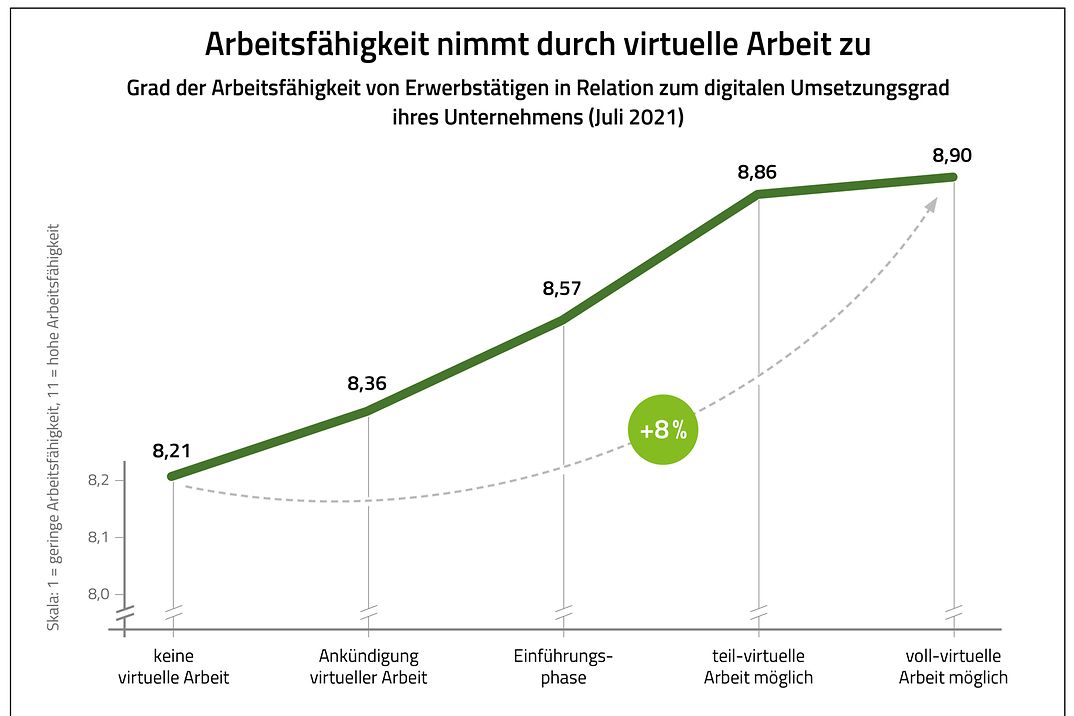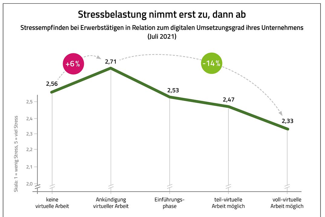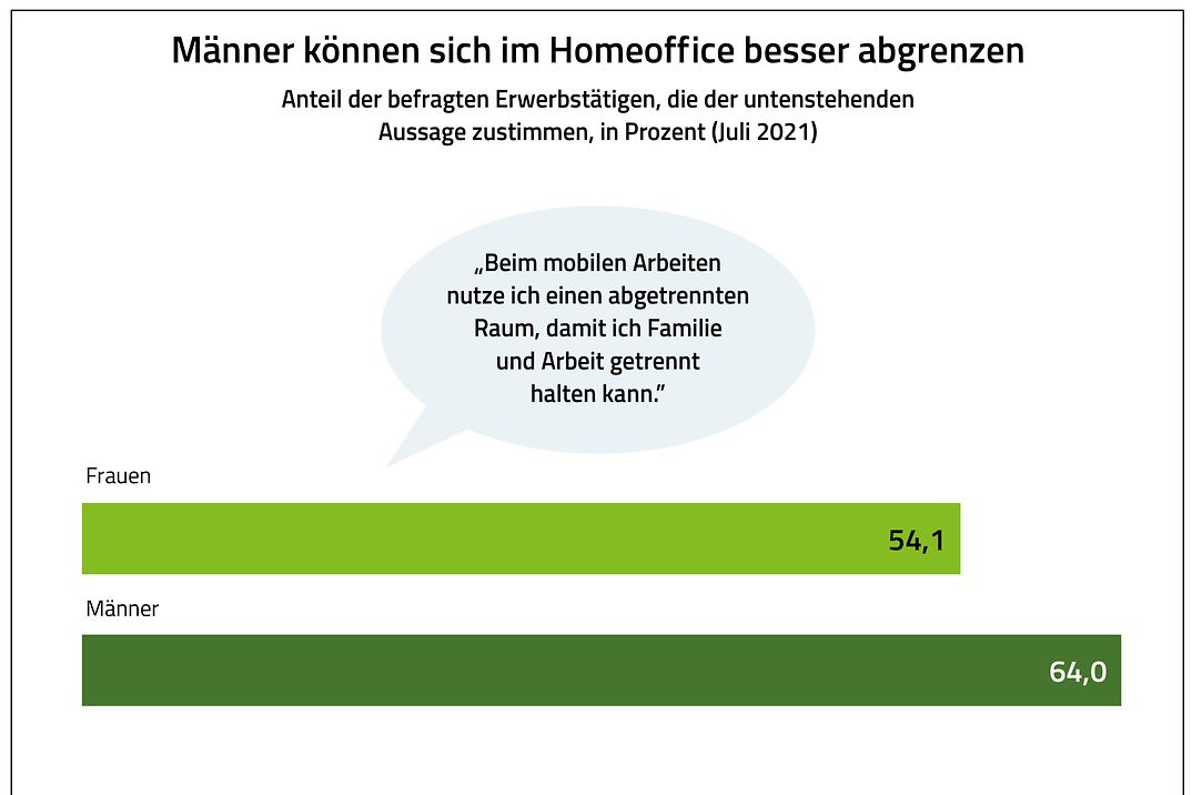 Laut der Digitalisierungsstudie fühlten sich seit Beginn der Pandemie bis Juli 2021 gleichbleibend rund 32 Prozent der Frauen und knapp 26 Prozent der Männer erschöpft. Auch die arbeitsbezogene Unsicherheit blieb praktisch konstant. Zuletzt klagten rund 18 Prozent der Frauen und 15 Prozent der Männer darüber. Dass die Werte nicht negativer ausfallen, schreibt die Studie unter anderem einem klaren Grenzmanagement zu.