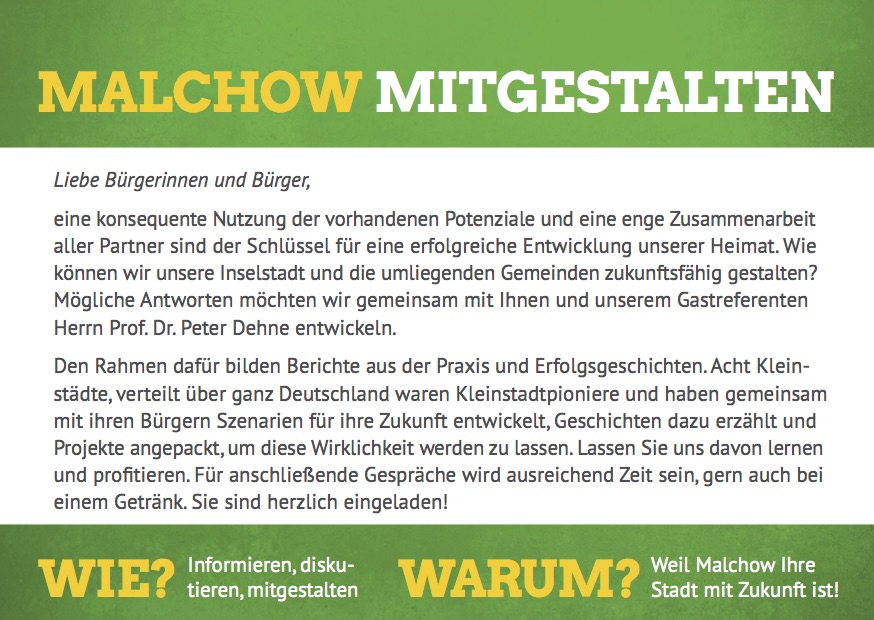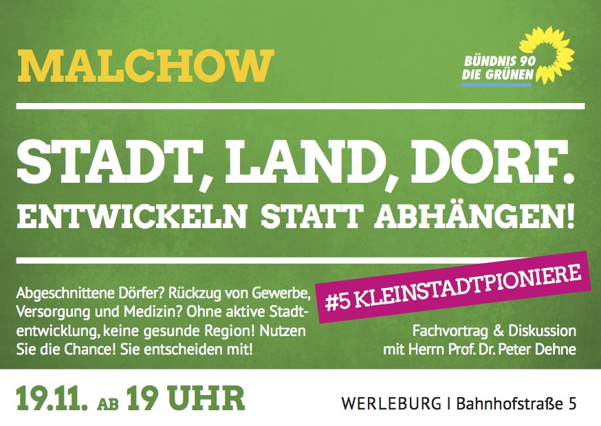 Herr Prof. Dr. Dehne berichtet von Modellvorhaben und guten Beispielen. Acht Kleinstädte, verteilt über ganz Deutschland waren Kleinstadtpioniere und haben gemeinsam mit den Bürgern Szenarien für ihre Zukunft entwickelt, Geschichten dazu erzählt und Projekte angepackt, um diese Wirklichkeit werden zu lassen. Forschungsprojekte zeigen die versteckten Potenziale und Möglichkeiten der kleinen Städte“, heißt es in der Ankündigung der Bündnisgrünen.