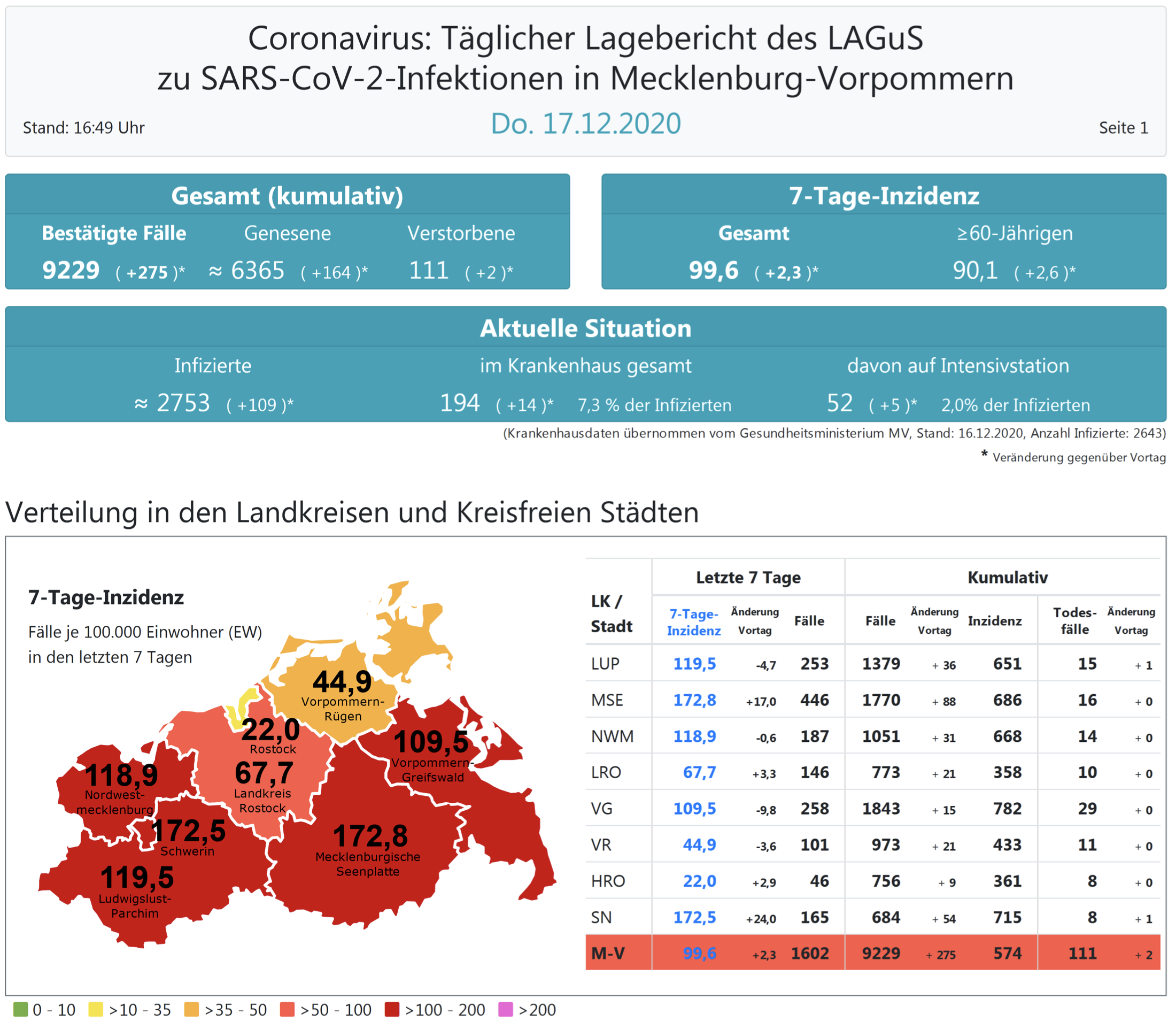 Insgesamt wurden in Mecklenburg-Vorpommern bisher 9229 Infektionen festgestellt. Im Land gab es bislang 111 Todesfälle, zwei mehr als gestern.