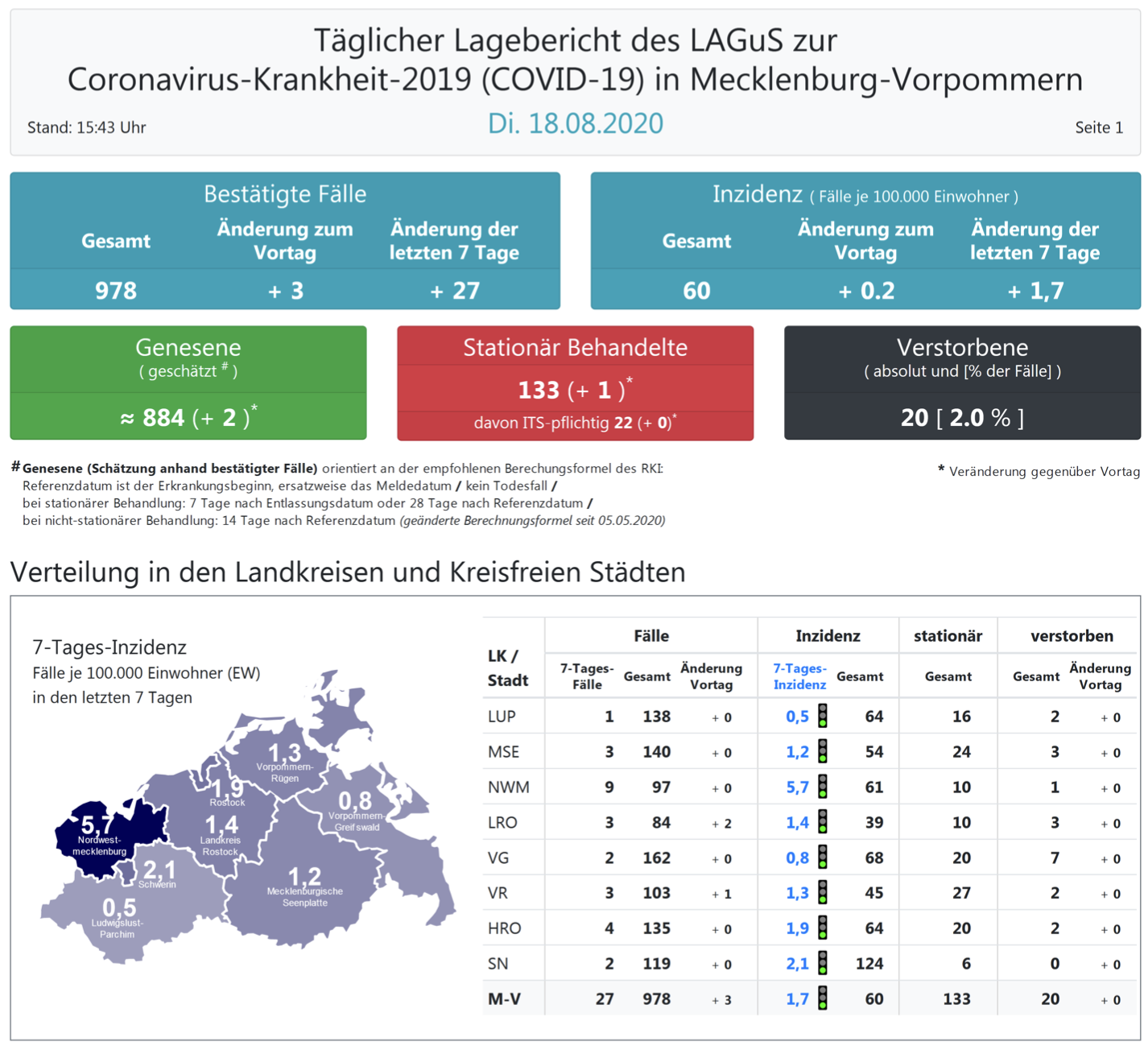 Laut einer Schätzung des Robert Koch-Instituts (RKI) sind in Mecklenburg-Vorpommern 884 (+2) der positiv getesteten Menschen von einer Covid-19-Erkrankung genesen. Insgesamt gab es bislang 20 Todesfälle im Land.